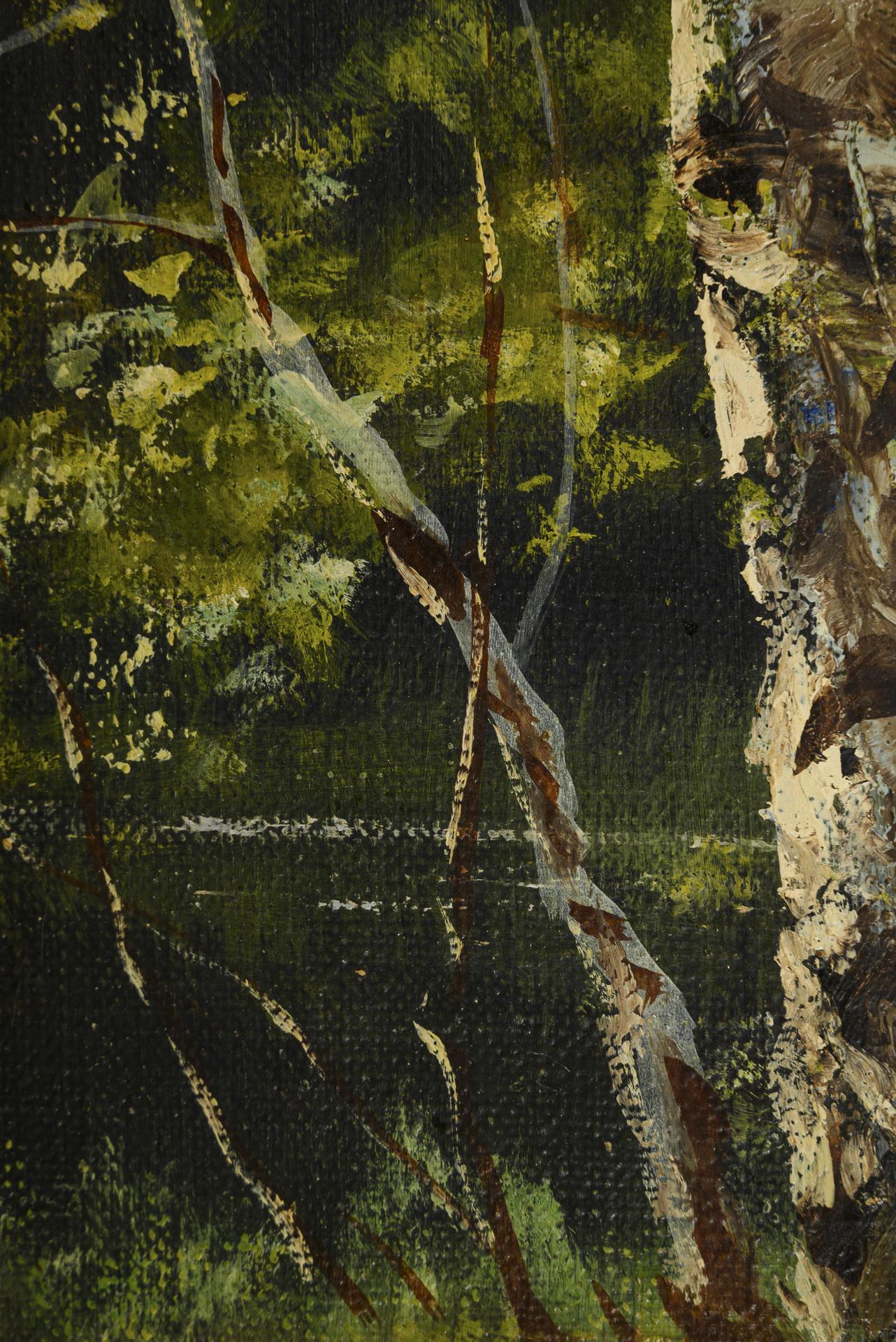 Birch trees on the bank near the dense trees of the forest.