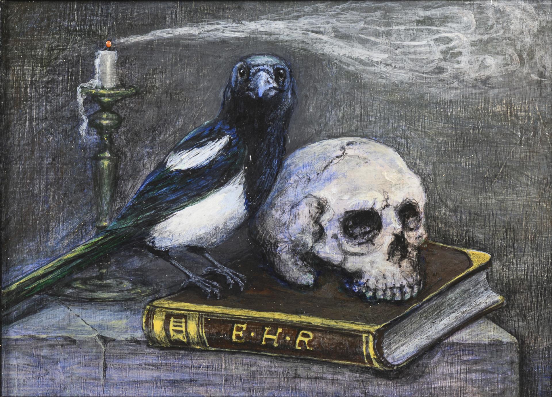 The bird with the skull on a book while the smoke in the form of a ghost drifts away from the extinguishing candle.