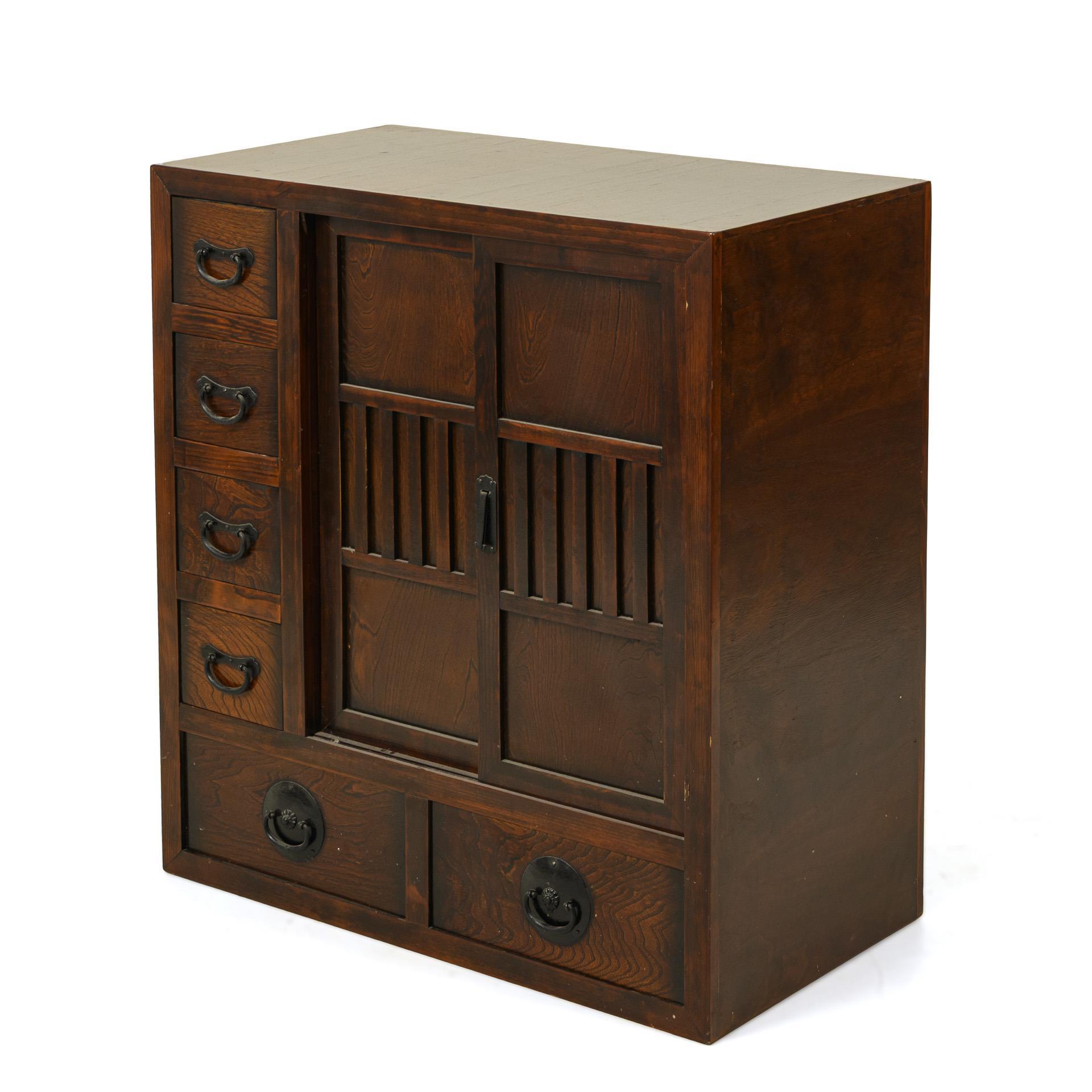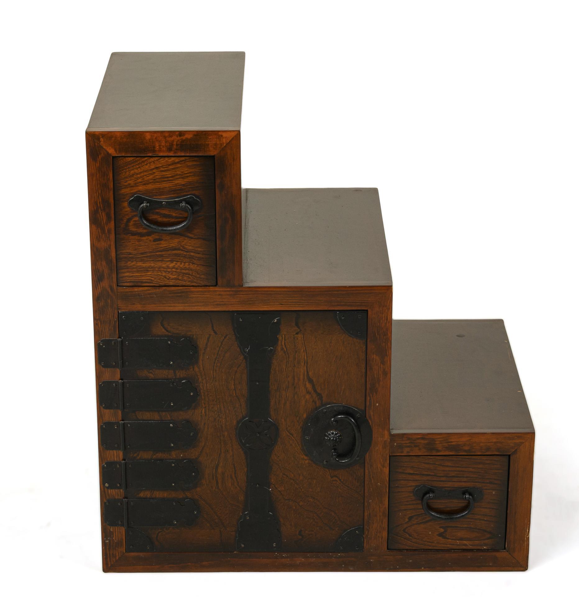 Three separately adjustable parts, all of which can be operated from two sides. One staircase section with 5 different drawers, other staircase section with two drawers and a large door compartment. Middle section with six drawers and a large compartment with sliding doors that can be locked by a simple mechanism. Could also be put together to form a high staircase and used as a room divider. Metal fittings. Slight signs of use and scratches.