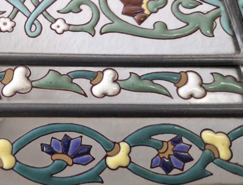 Rectangular window with raised enamel painting in the style of Turkish İznik ceramics: framed by a floral and ornamental border, a mosque lamp with stylized flower bouquet, crowned by pseudo-Arabic characters.