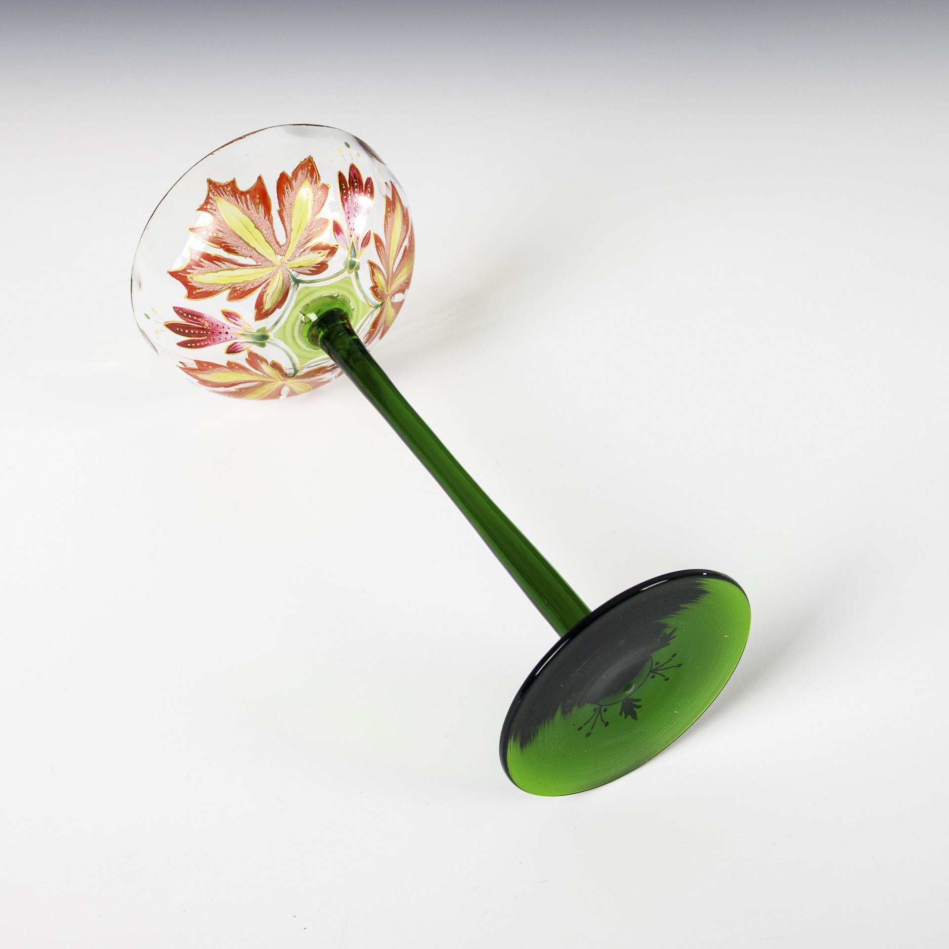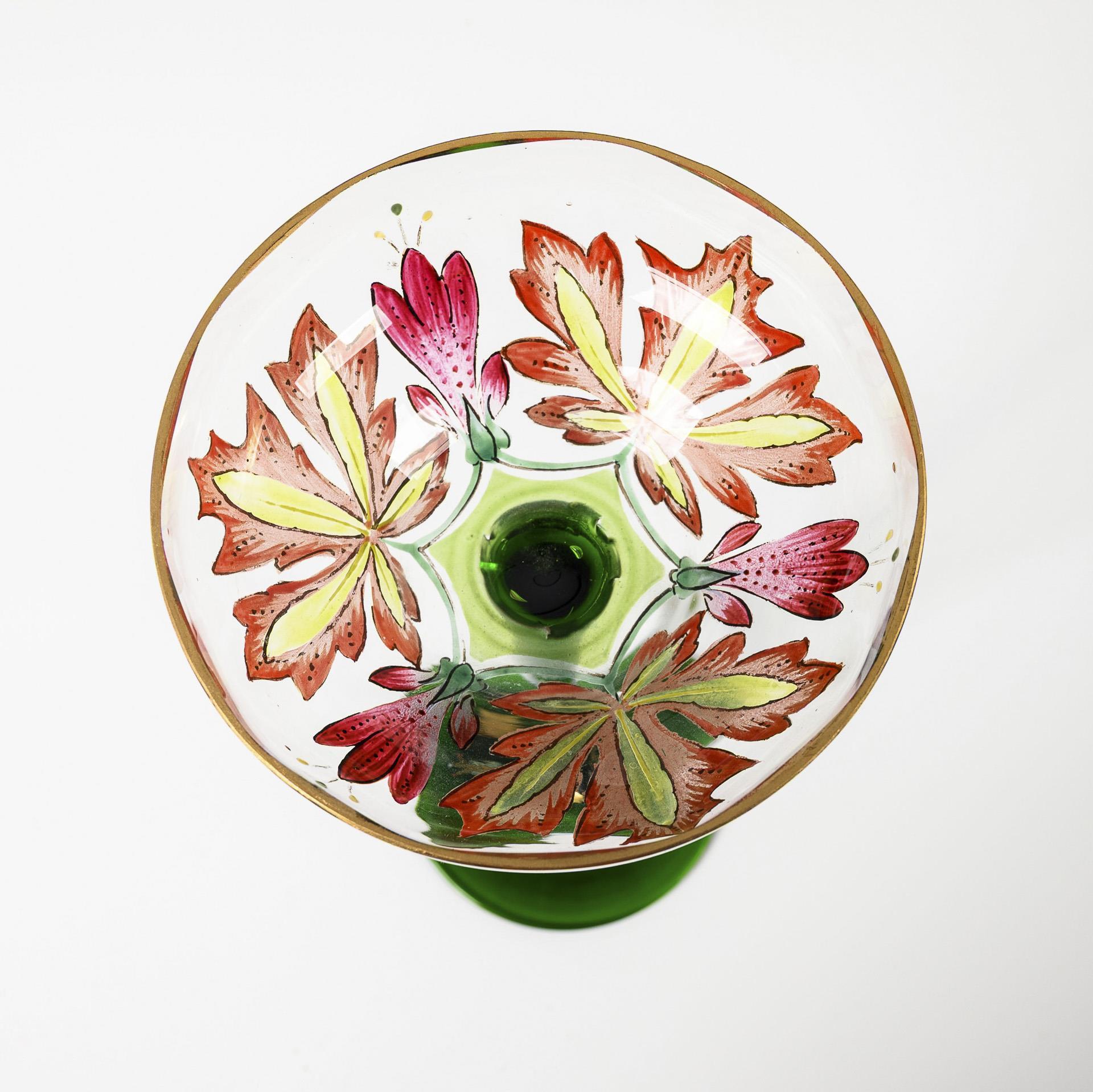 Bowl-shaped, lengthwise optically mold-blown bowl of clear glass with polychrome enamel and gold-painted rosette of autumn crocus flowers and maple leaves, stem and round base of dark green glass. Minimal chip (Ø 1mm) on the rim.