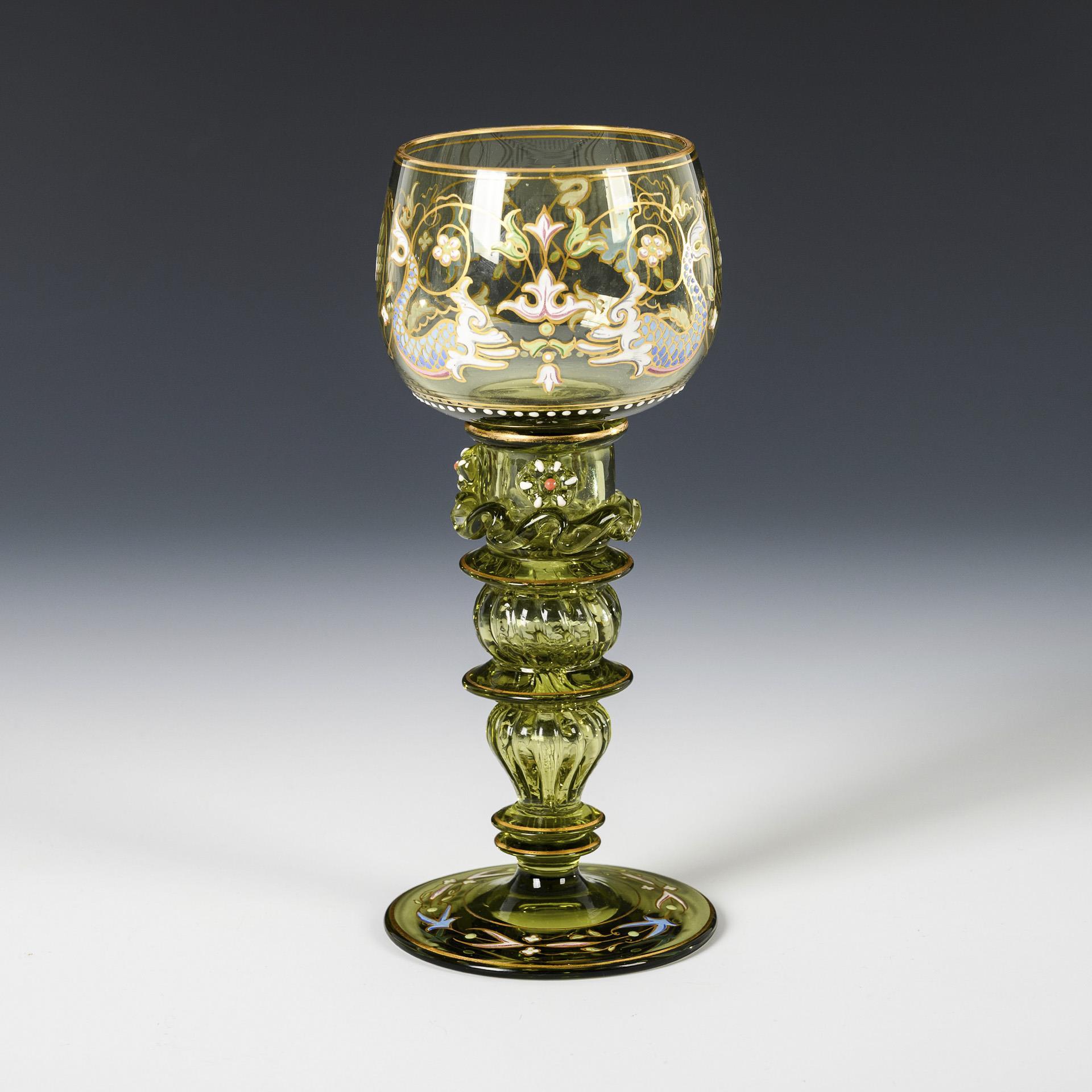 Bellied bowl, multi-jointed, partly vertically ribbed hollow stem with wavy band and applied berry scales, round foot. Stylized plant motifs with dolphins on the dome and foot.