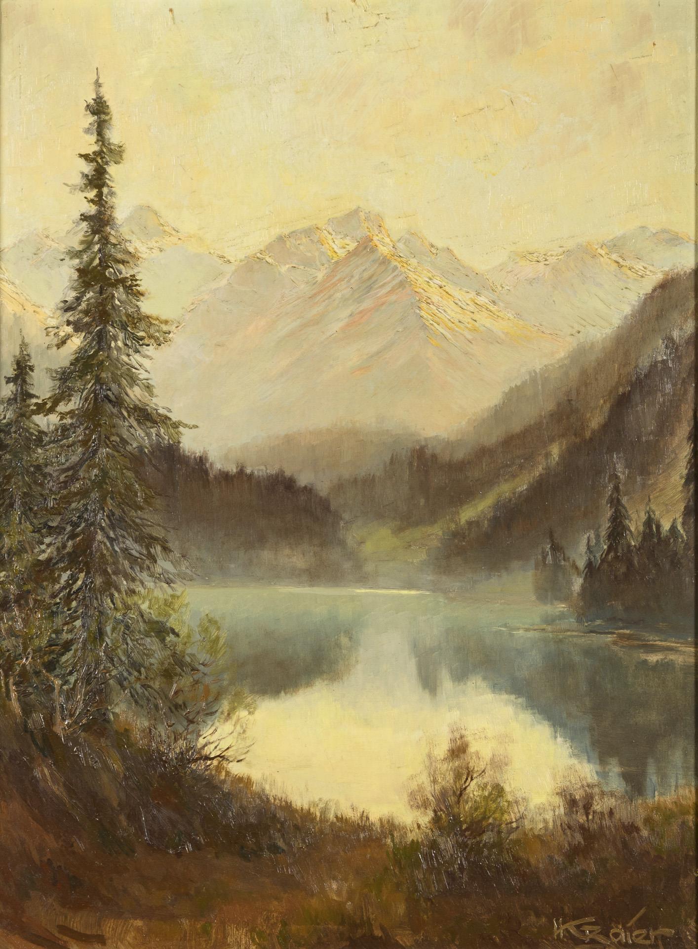 Mountainous landscape with reflecting lake surface under a bright sky.