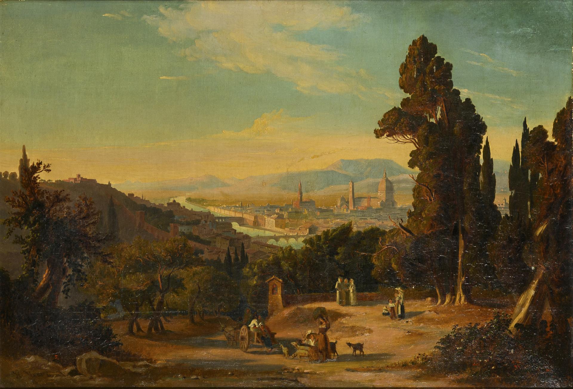 Staffage figures in the Tuscan mountains in the sunshine with a view down to the city on the Arno under a blue sky. Canvas wax-doubled.