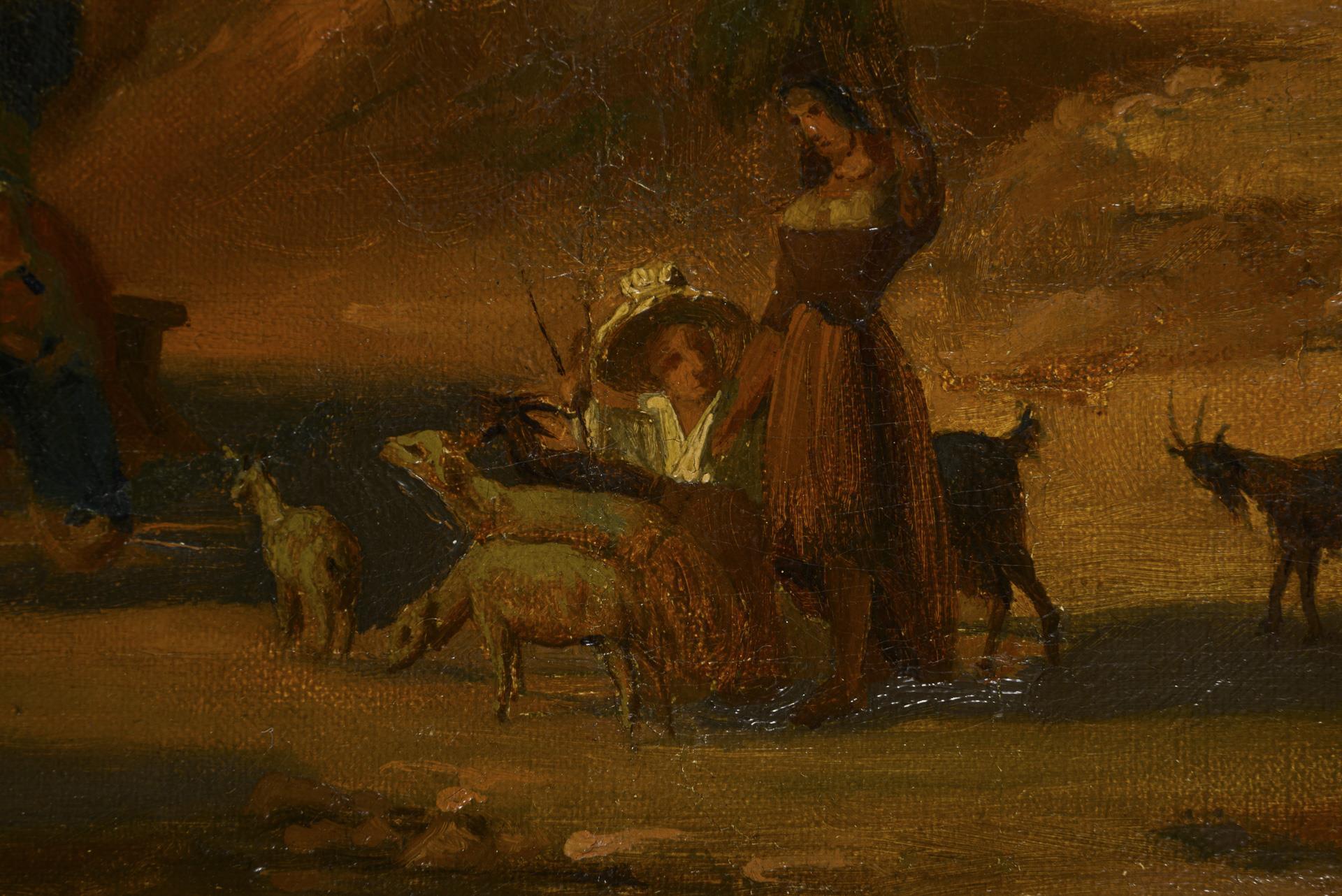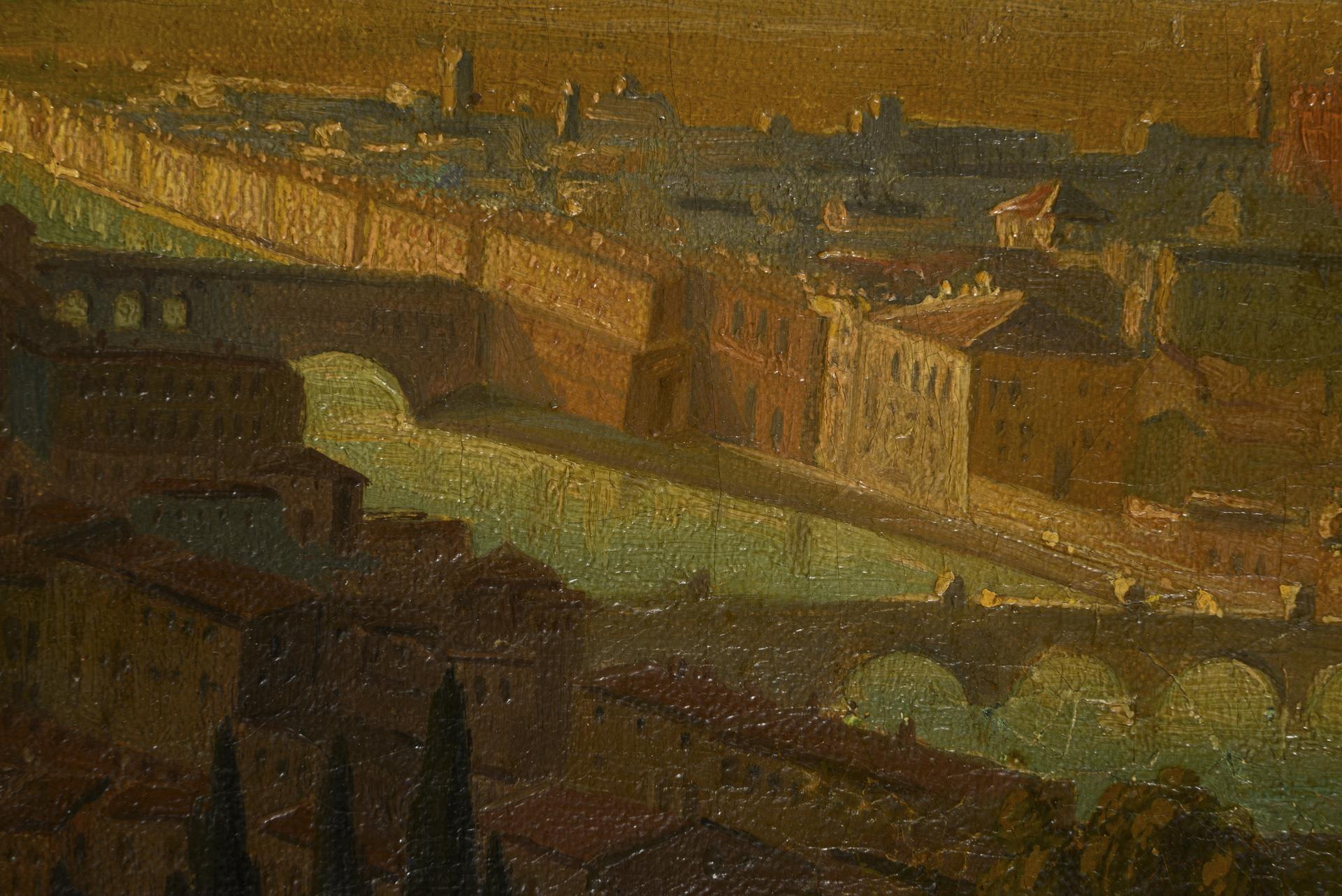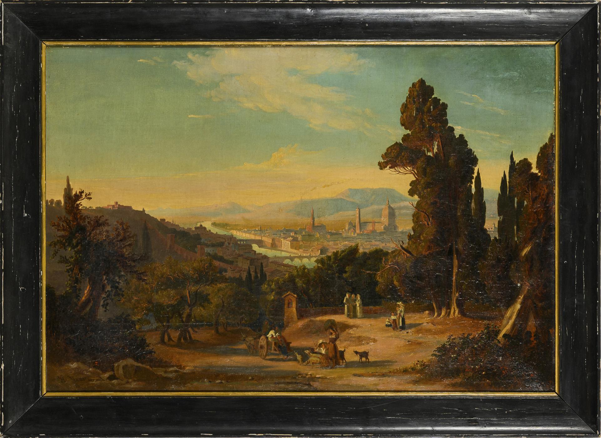 Staffage figures in the Tuscan mountains in the sunshine with a view down to the city on the Arno under a blue sky. Canvas wax-doubled.