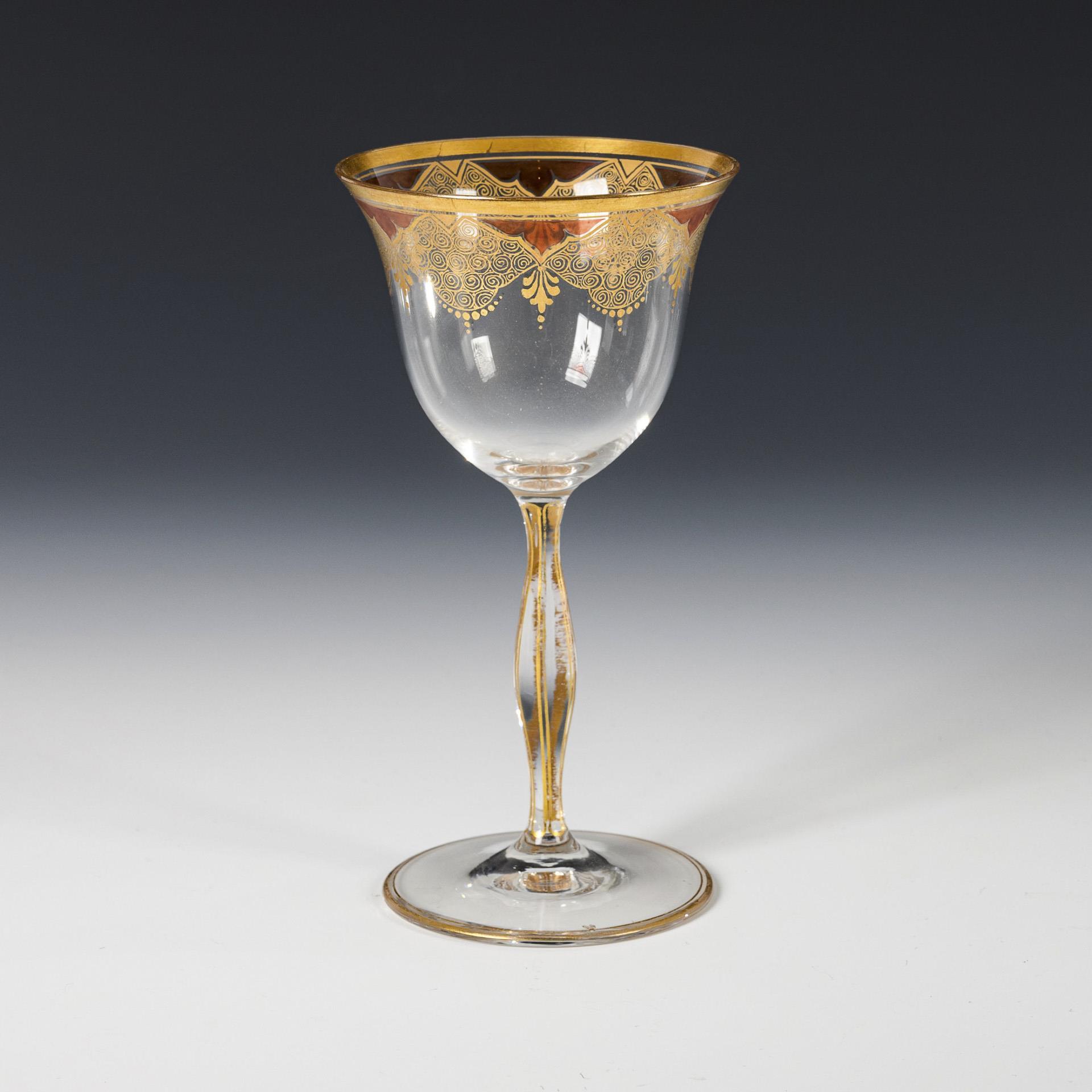 Wine glass with bell-shaped bowl, baluster stem, round foot. On the bowl a border of finely gold-painted ornamental cartouches with red transparent enamel in the spandrels. Minimal gold abrasion on the foot rim.