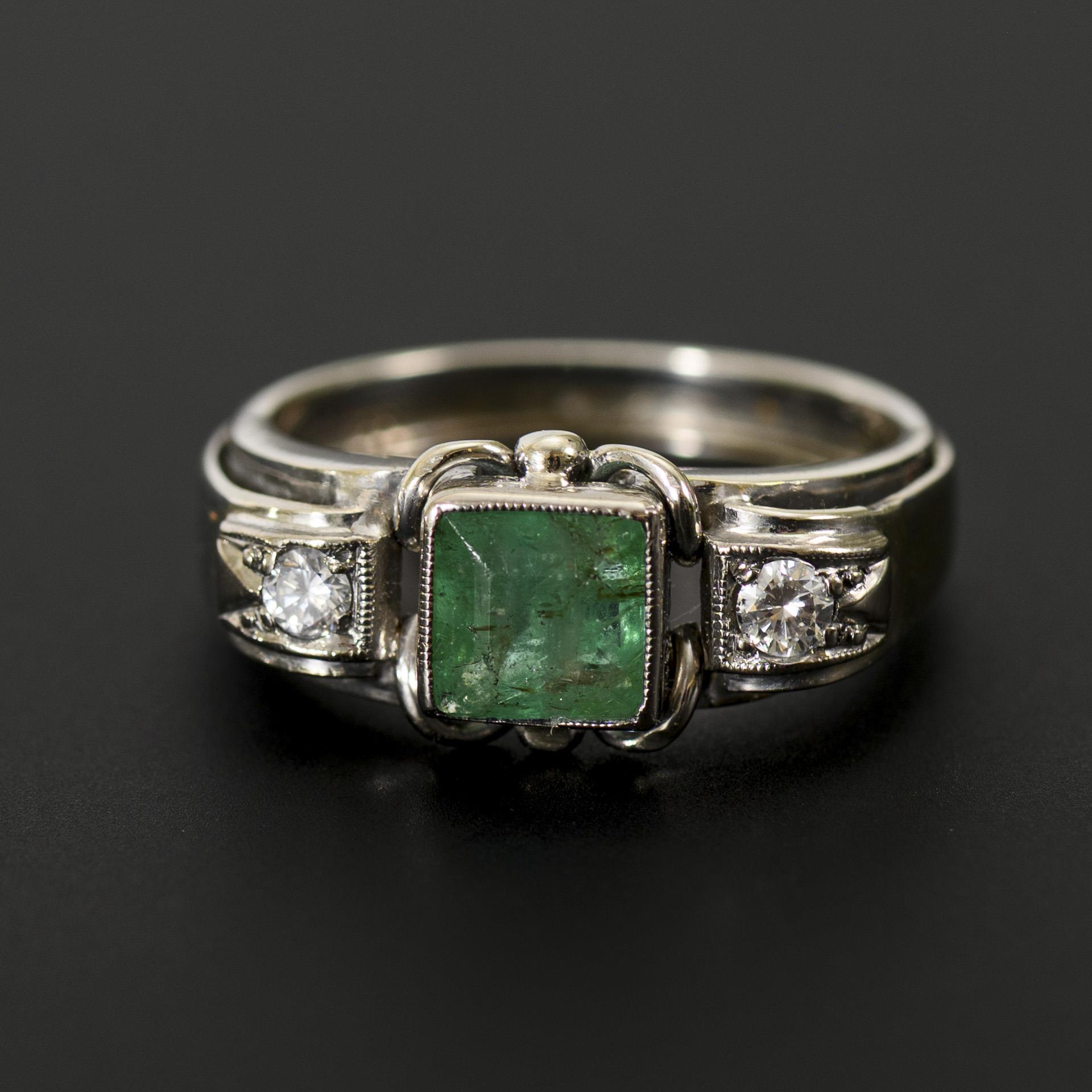 Art Déco ring with green stone, probably emerald, and two brilliant-cut diamonds.