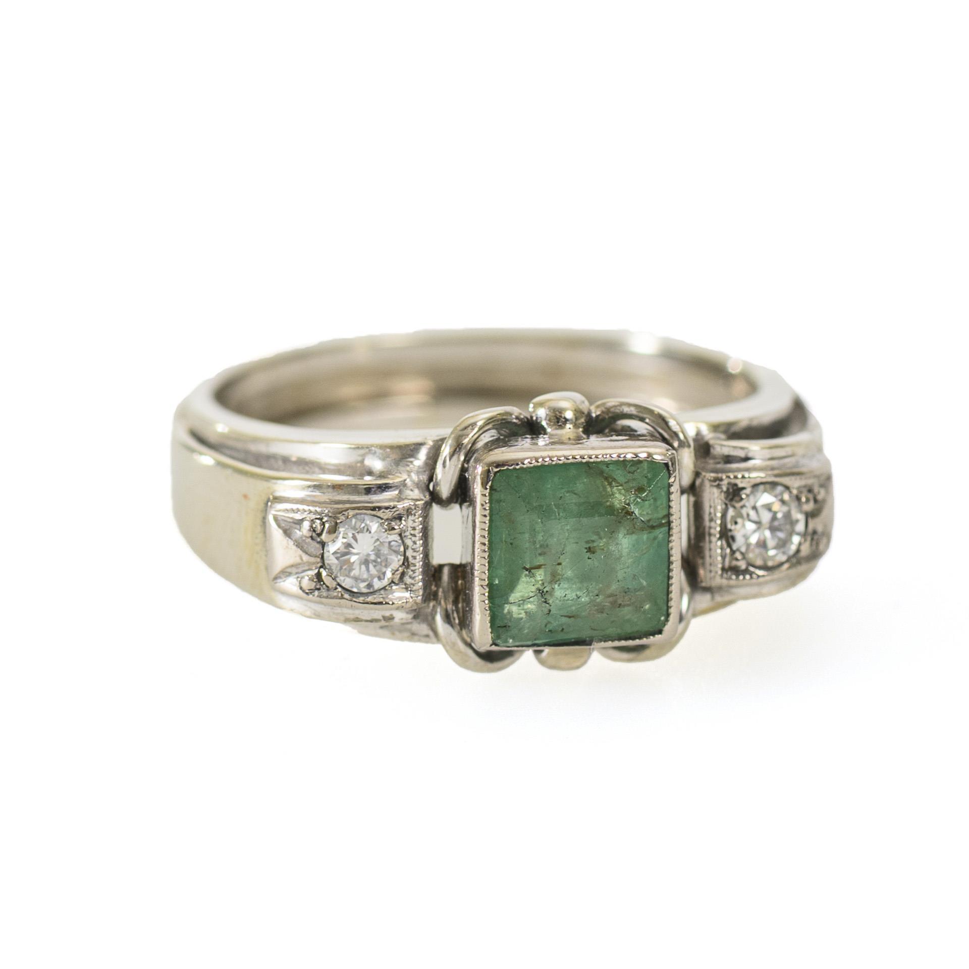 Square-cut green stone with clear jardin, probably emerald, in bezel setting. Each of the ring shoulders set with an embedded brilliant-cut diamond, the ring band in a raised design typical of the style. Small damage to one edge of the bezel setting; stone holds securely.