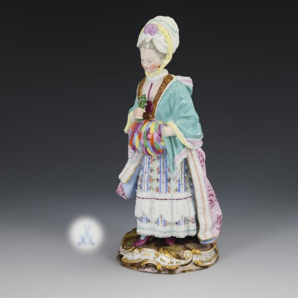 Lady in winter dress standing on a rocaille and terrain base, contemplating a bouquet of forget-me-nots. Bouquet minimally restored.