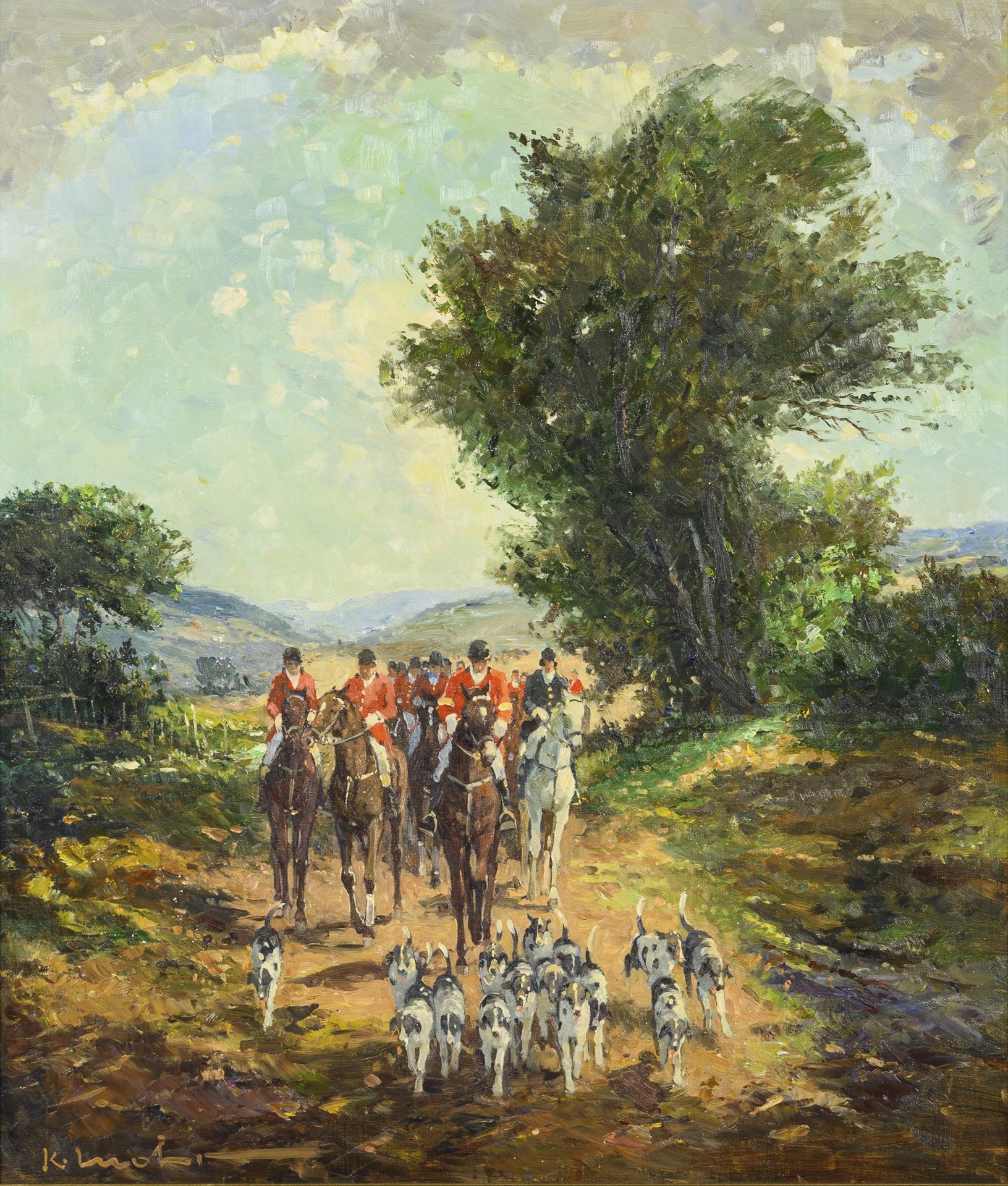 The horsemen in the classic red and white uniforms with the hounds on a path to the hunt.