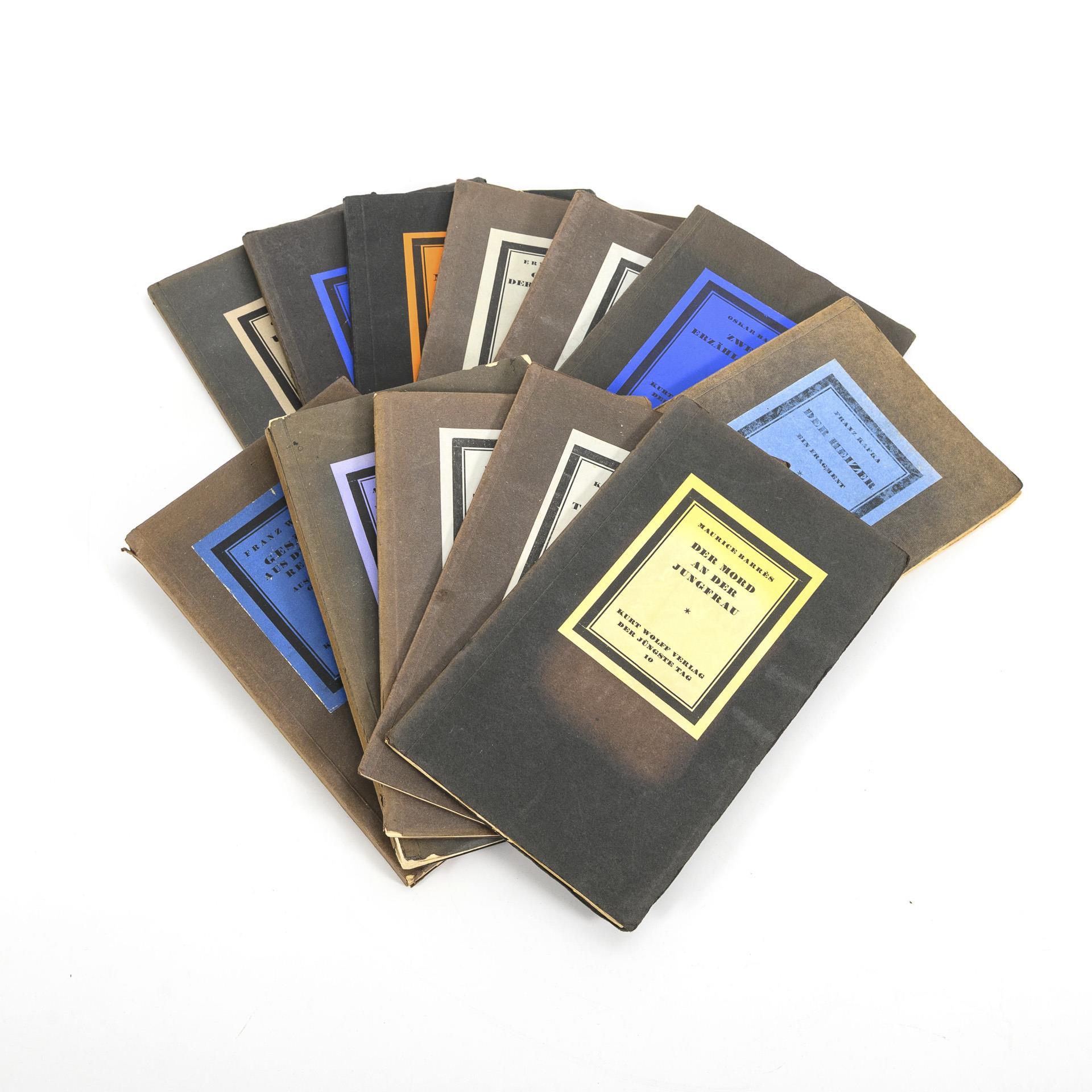 Uniform brochure booklets with partly colored title labels. Franz Kafka: "The stoker, a fragment". With the Saxon censorship stamp in the form of the Monument to the Battle of the Nations (mandatory from May 1, 1917). (Sheets almost loose). / Carl Sternheim: "Napoleon", "Meta", "Ulrike". / 2x Ernst Toller: "Poems of the prisoners". / Oskar Baum: "Two stories". / Franz Werfel: "Songs from the Three Realms". / August Strindberg: "The Keys of the Kingdom of Heaven". / 2x Otfried Kryzanowski: "Our daily poison". / Maurice Barrès: "The Murder of the Virgin". Only minimal bumping.