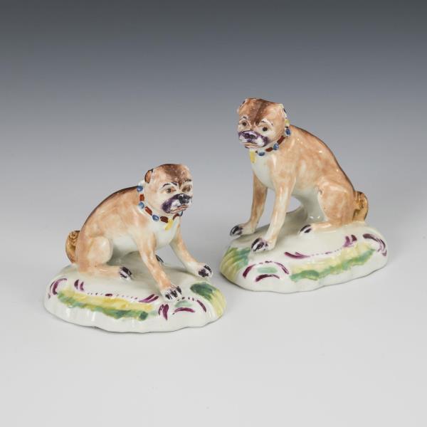 Pendants of two pugs on a rocaille base. Both pug tails restored, partially rubbed.