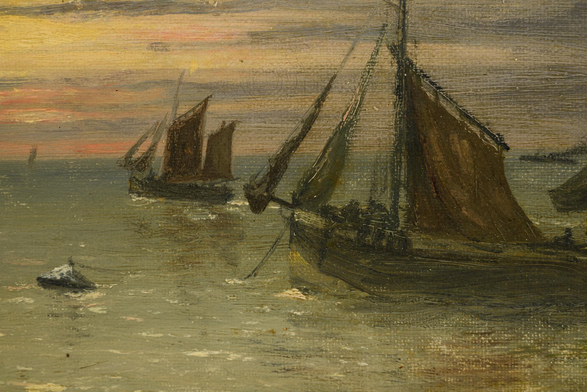 Several sailors near the beach at sunset. Doubled canvas.