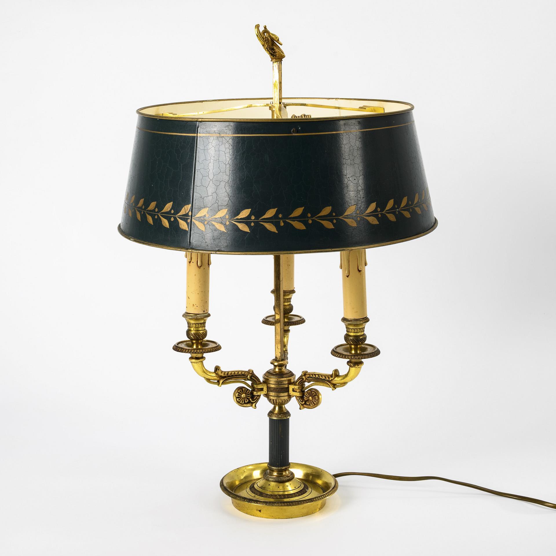Bowl base, fluted shaft painted green, 3 decorated volute arms with electric candles, central square rod, arrow-shaped locking screw for the height-adjustable shade (outside green with golden leaf frieze, inside painted white), swan figure as crown. Swan probably supplemented, wired younger, works.