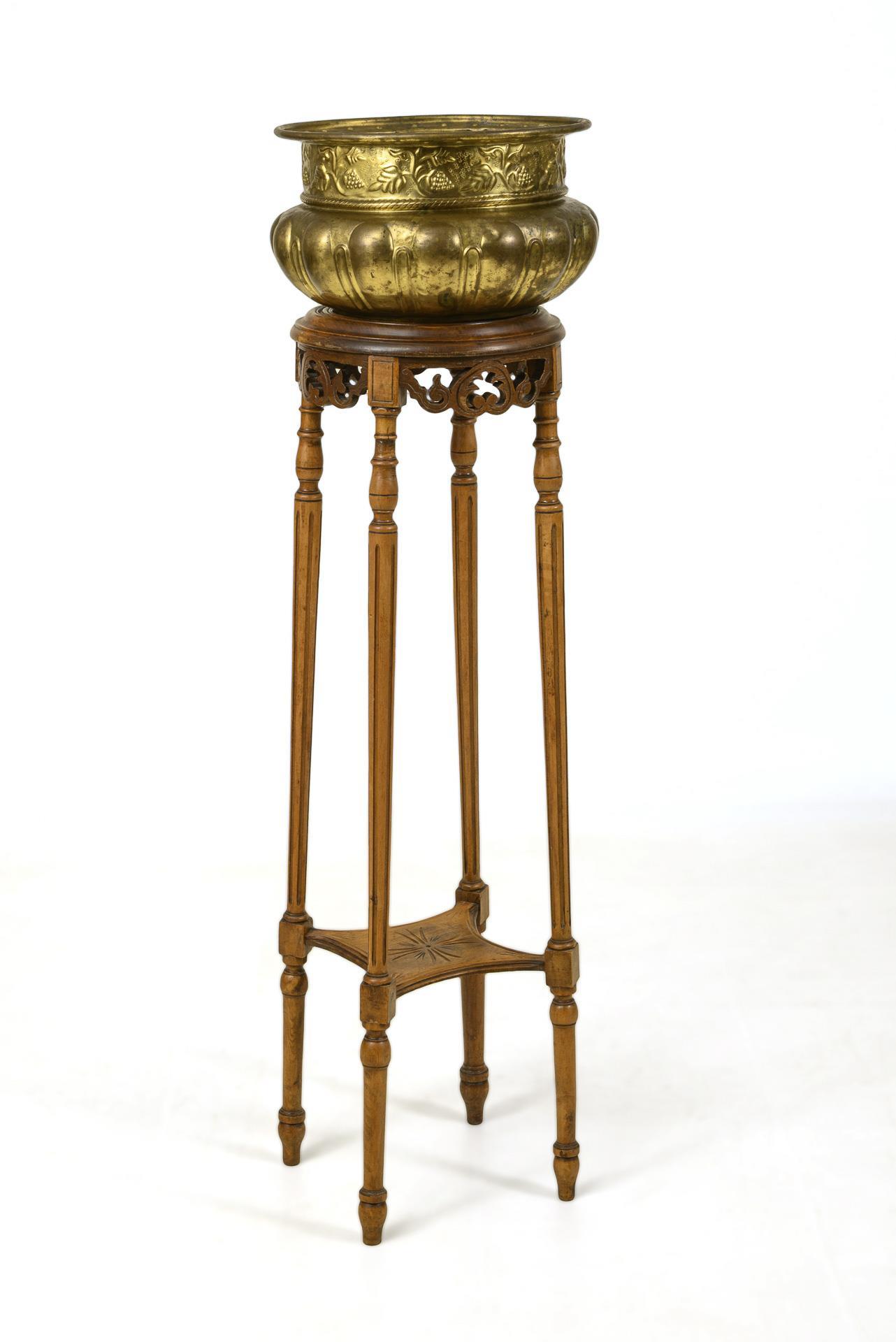 Historicist frame with 4 slender turned columns, round, profiled top plate with stone inlay and floral openwork frame, shelf with 4 concave sides. Comes with a cachepot made of embossed and punched sheet brass with a flanged rim, humped wall and surrounding grape decoration on the retracted neck. Restored, with additions, rubbing.