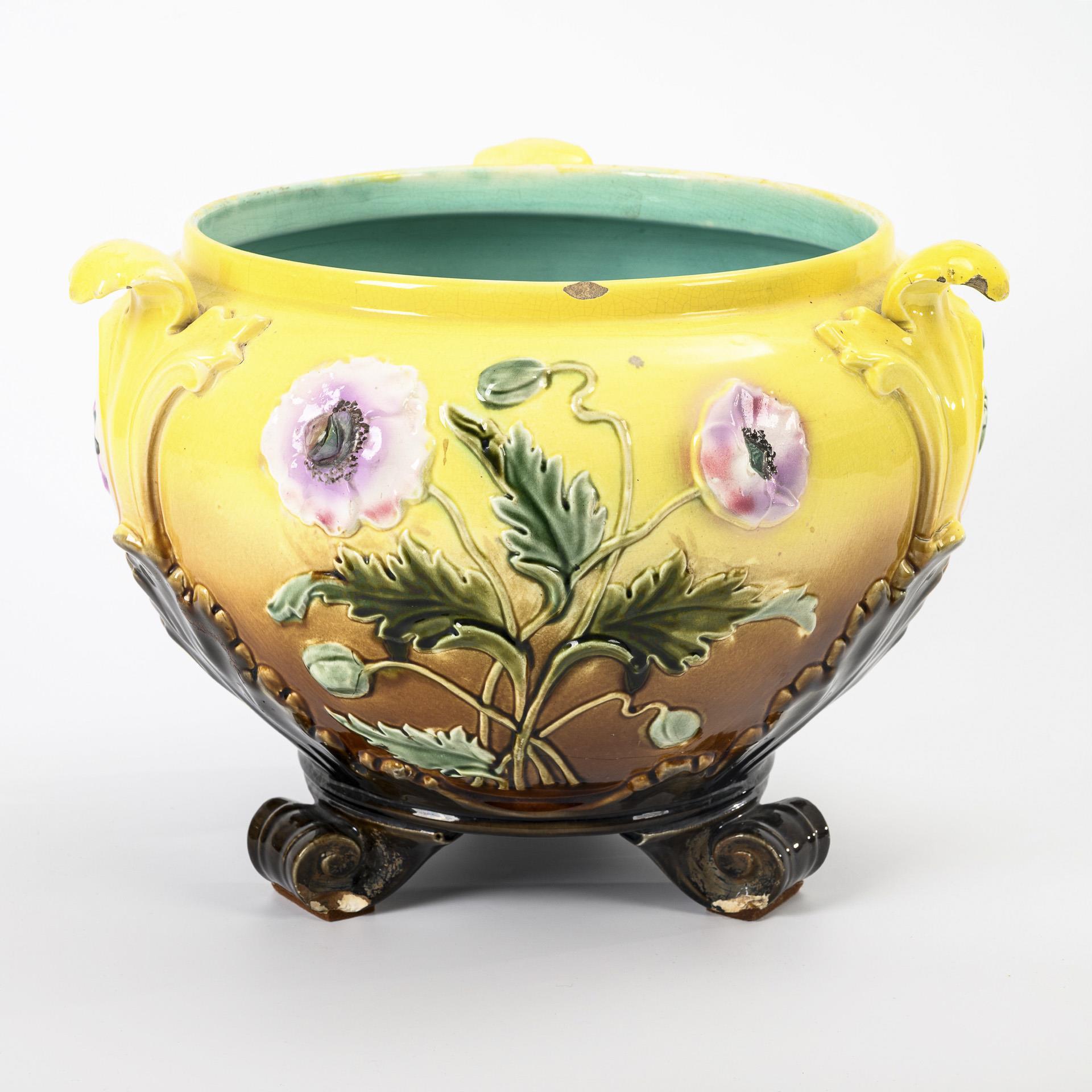 Cachepot with floral relief wall, on 3 volute feet. Multiple knocks, partly cracked, 1 sheet glued.