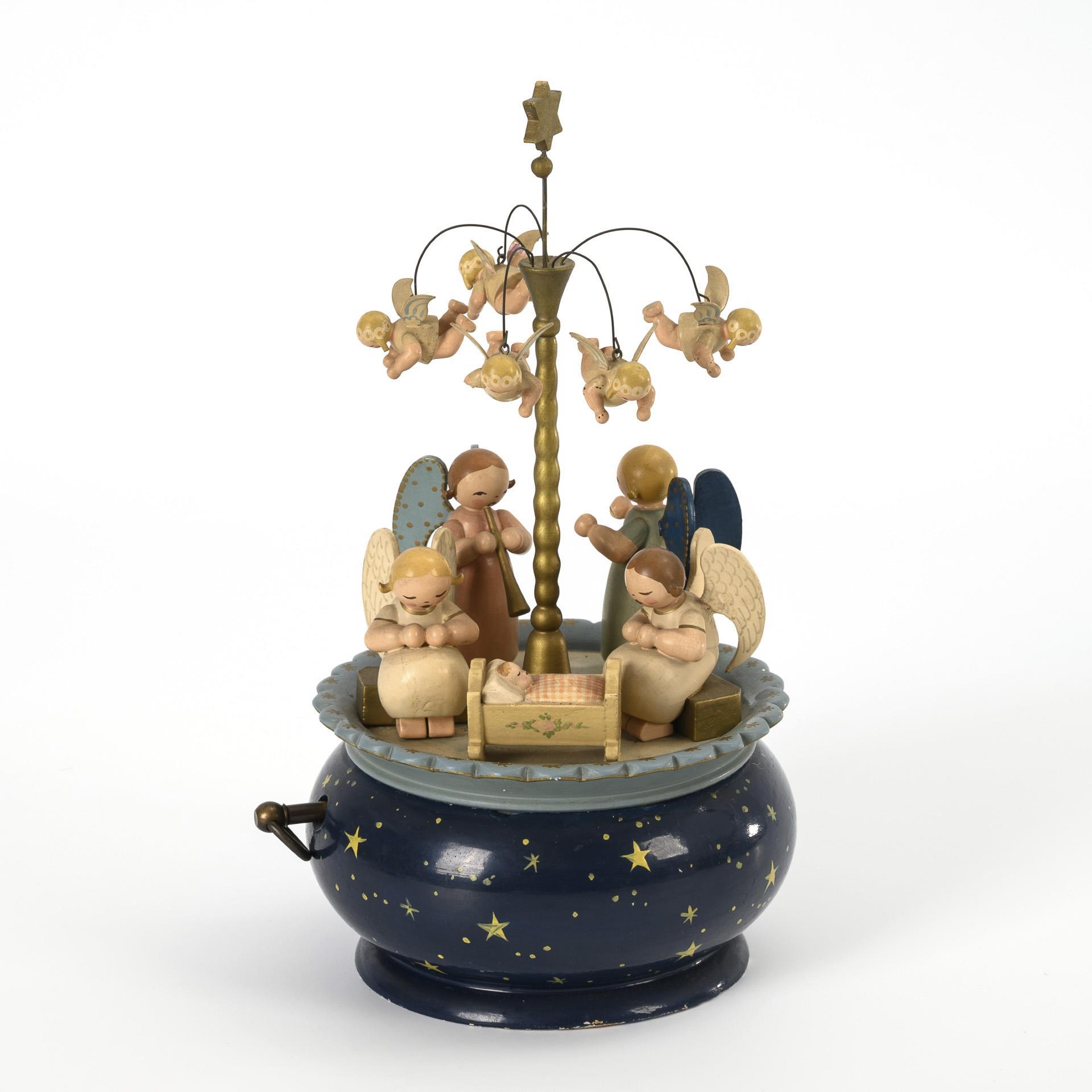 Intact music box, plays the melody "Guten Abend, gute Nacht". Musical mechanism cleaned. Slight signs of age and small defects.
