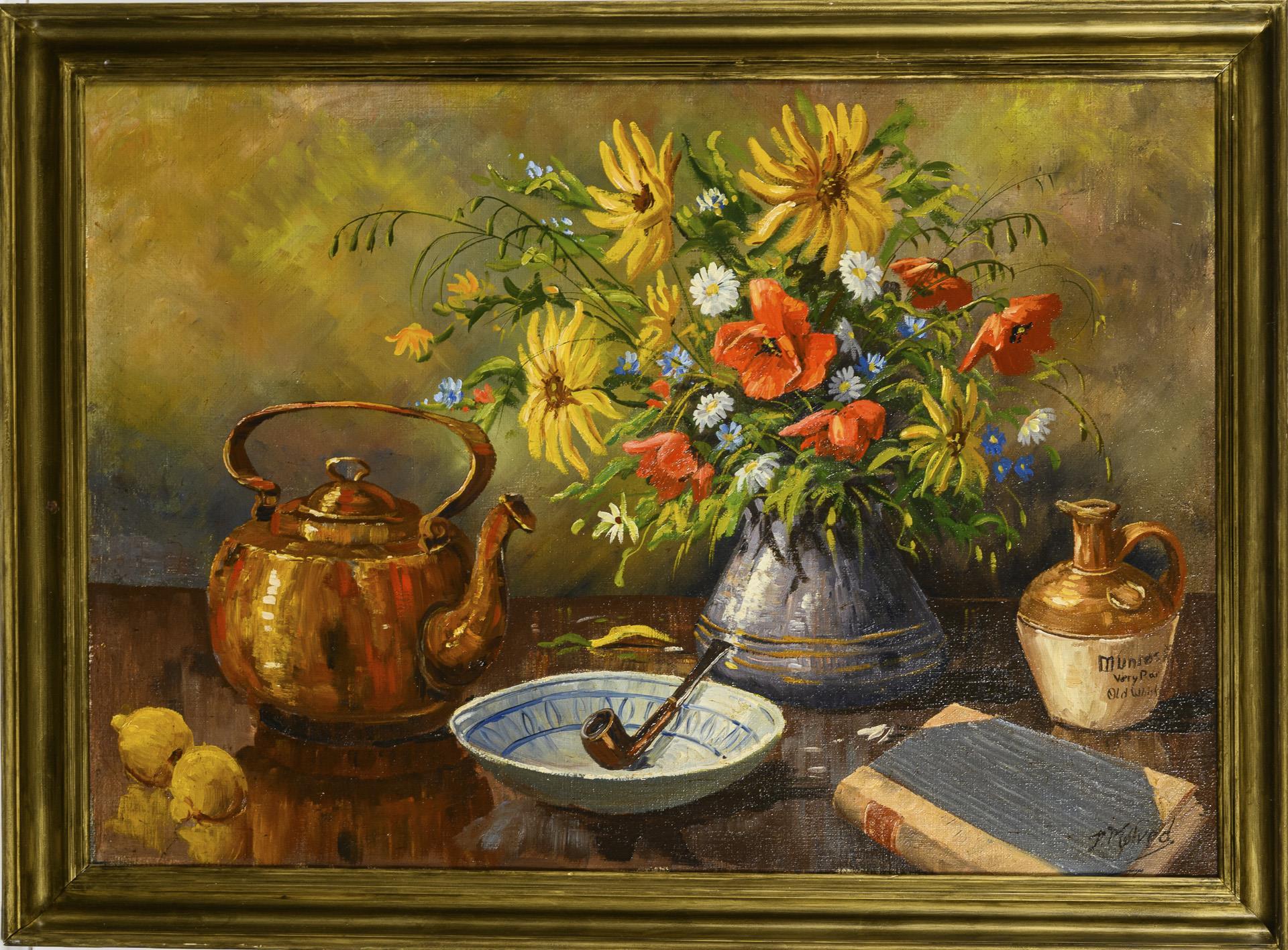 Meadow flowers next to a copper teapot, a pipe on a plate as well as a book and a pot.