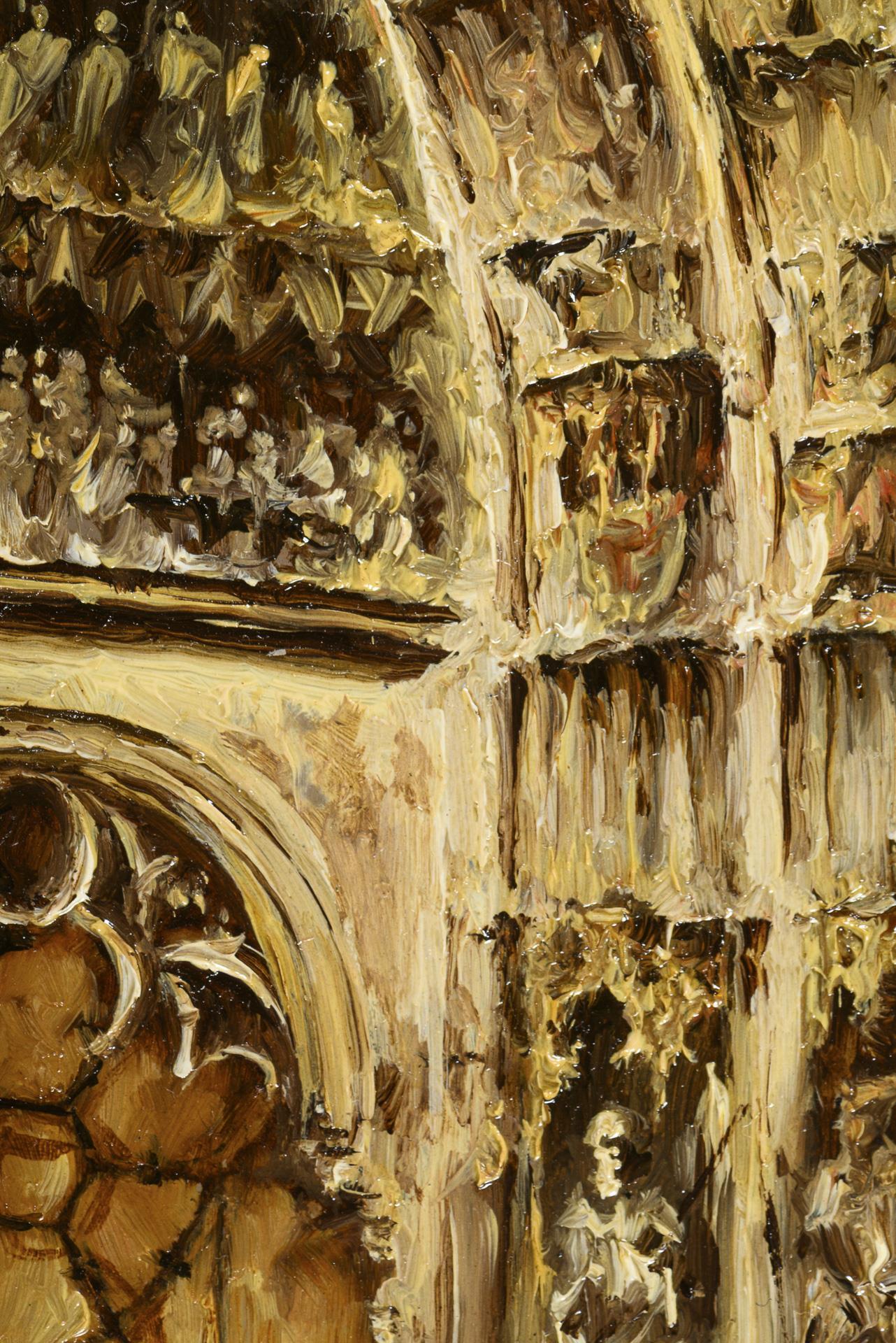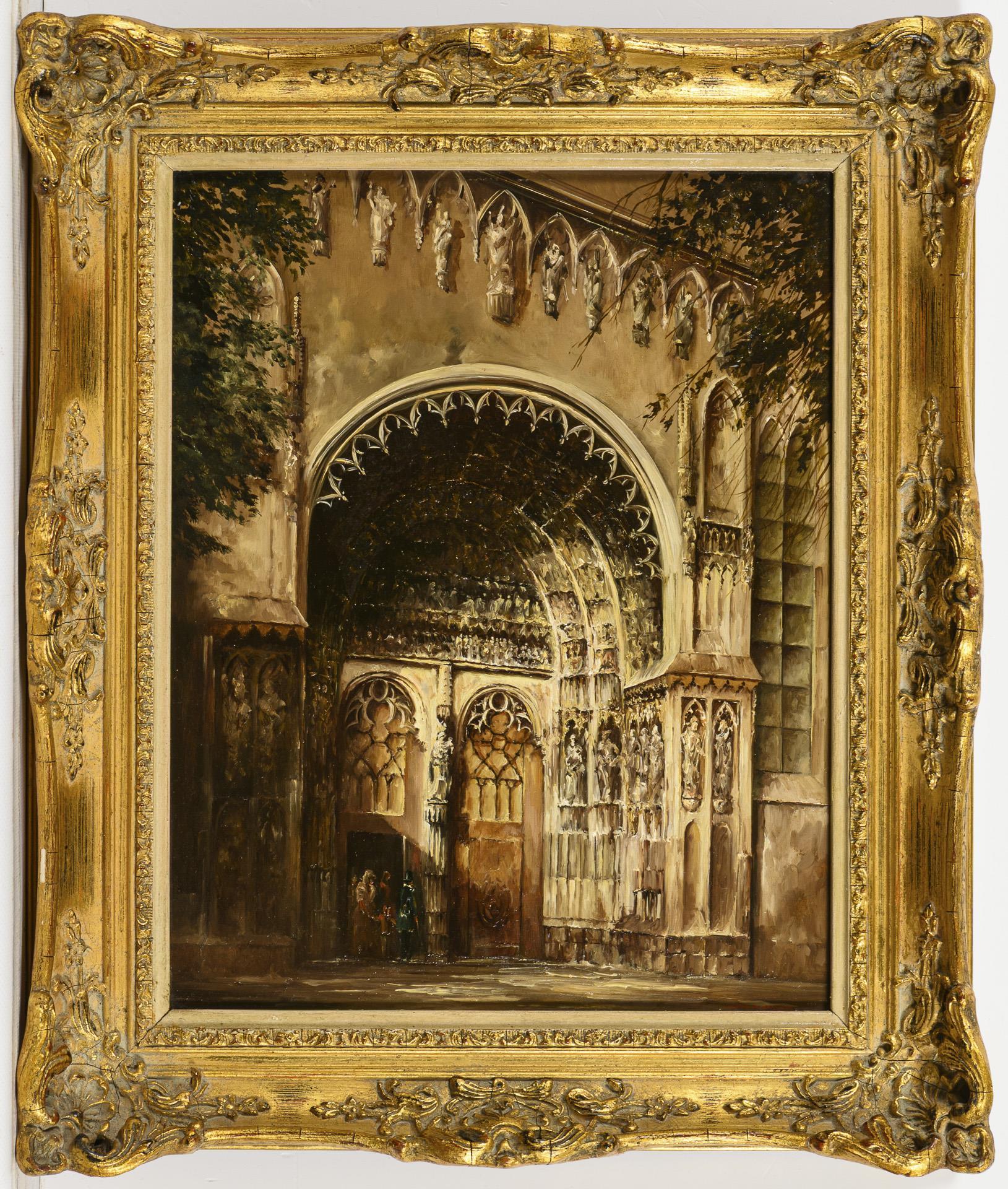Staffage figures at the entrance to the portal in the incoming sunshine.