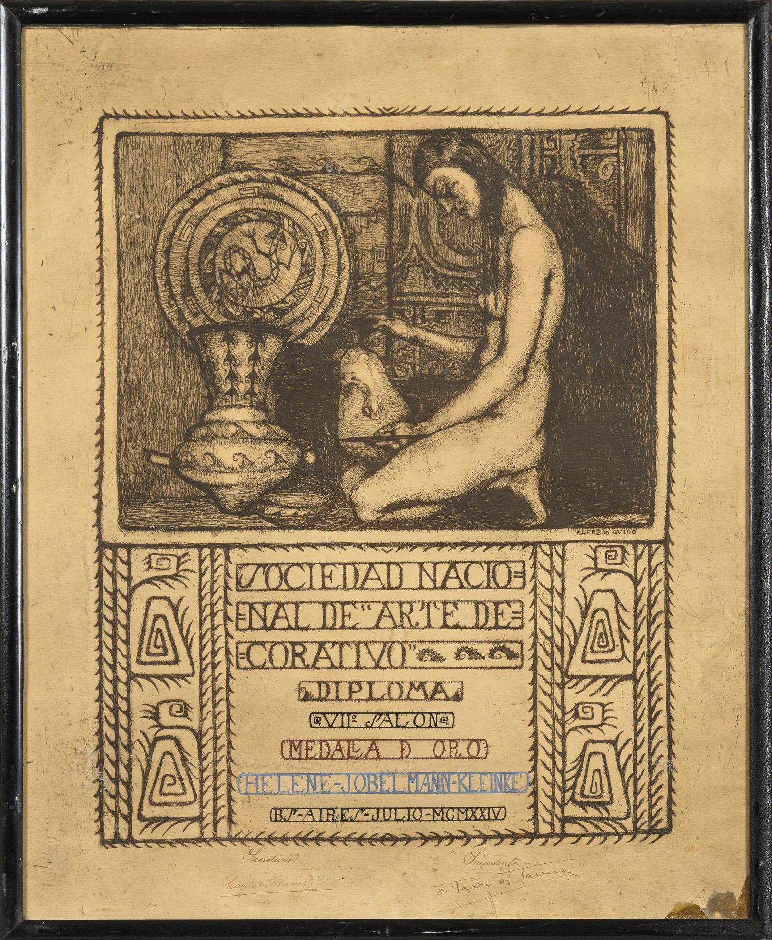 "Sociedad Nacional de Arte Decorativo, Diploma, VII Salon,medalla D'Oro, Helene Jobelmann-Kleinke, BS-Aires Julio MCMXXIV". With the handwritten signatures of the president and secretary. In the upper part portrait of a female nude between South American antiques. Sheet torn several times in the margins, probably traces of glue at lower right.