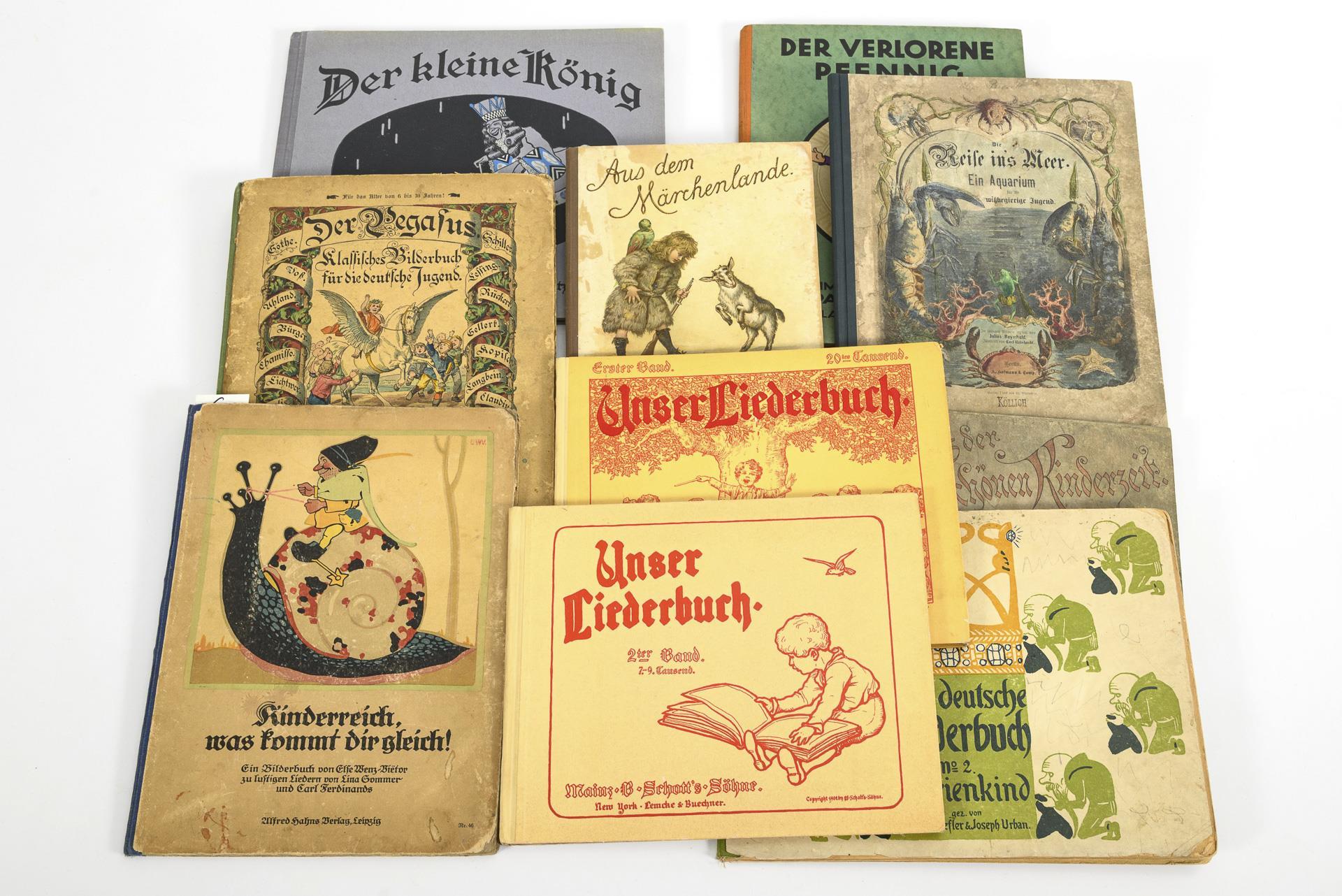 "Aus dem Märchenlande", Theo. Stroefers Kunstverlag, Munich / "Aus der schönen Kinderzeit", verses by A. Steinkamp, drawings by E. Voigt, hardcover / "Marienkind", Das deutsche Bilderbuch No. 2, drawn by Heinrich Lefler and Joseph Urban, Jugendstil / 2x "Unser Liederbuch" 1ter und 2ter Band, Mainz B. Schott's Söhne, 1900 and 1902 / "Kinderreich was kommt dir gleich!", Else Wenz-Vietor, Lina Sommer, Carl Ferdinands, Alfred Hahns Verlag, Leipzig / "Der Pegasus - Klassisches Bilderbuch für die deutsche Jugend", H. Oswald, Eugen Klimsch, Frankfurt a.M. Literarische Anstalt Rütten & Loening / "Der kleine König", Hanns Pellar, Fritz von Ostini, published by Georg W. Dietrich, Munich. / "Die Reise in's Meer - Ein Aquarium für die wißbegierige Jugend", Julius Reymhold, Carl Reinhardt, Berlin by A. Hofmann & Comp. / "Der verlorene Pfennig", Arpad Schmidhammer, Verlag Jos. Scholz, Mainz. All with color illustrations, in age-appropriate good condition.