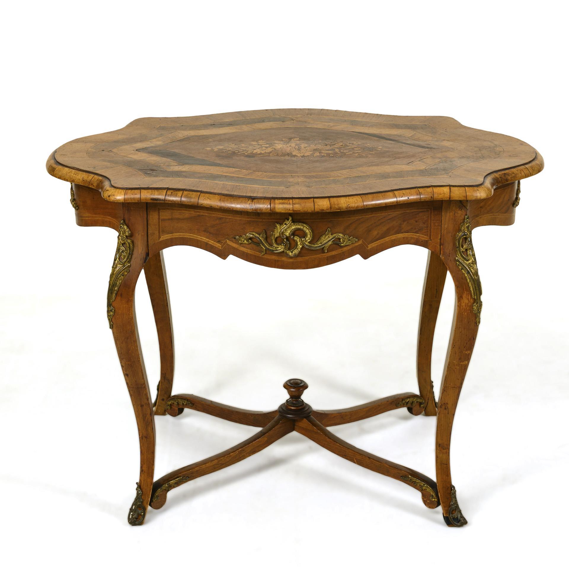 Neo-Baroque salon table with floral inlays and bronze fittings.