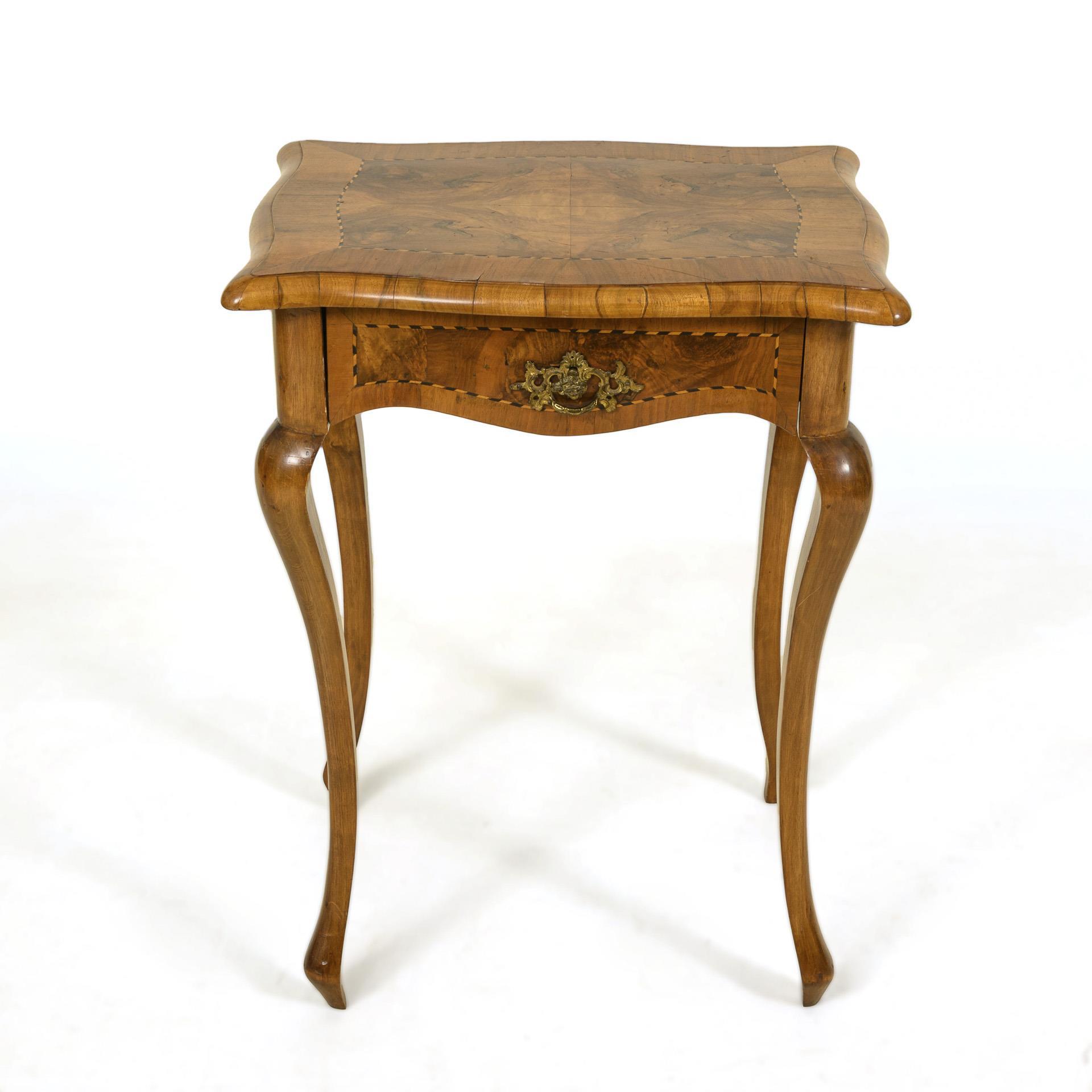 Curved, protruding top over 1-shelf frame and 4 s-shaped curved legs. Lively veneer pattern with contouring, two-tone ribbon inlays. Floral brass keyhole fitting. In the drawer 1 large and 3 small compartments, 1 of which with lid and pin cushion. Restored, with additions, partial defects.