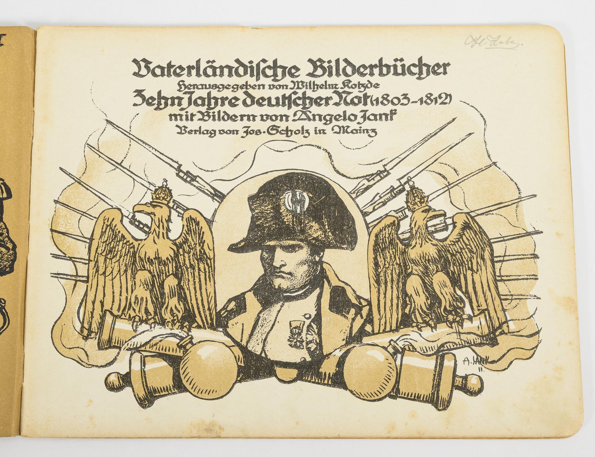 Publisher Wilhelm Kotzde: "Zehn Jahre deutscher Not (1803 - 1812)" / "Die Wacht am Rhein" / "Nach Frankreich hinein (1814-1815)" / "Frühling und Freiheit (1813)" all with pictures by Angelo Jank / "Bismarck" with pictures by Karl Bauer. Always 8 pages with color lithographs, in half cloth binding. Signs of wear commensurate with age, one book with torn cover.