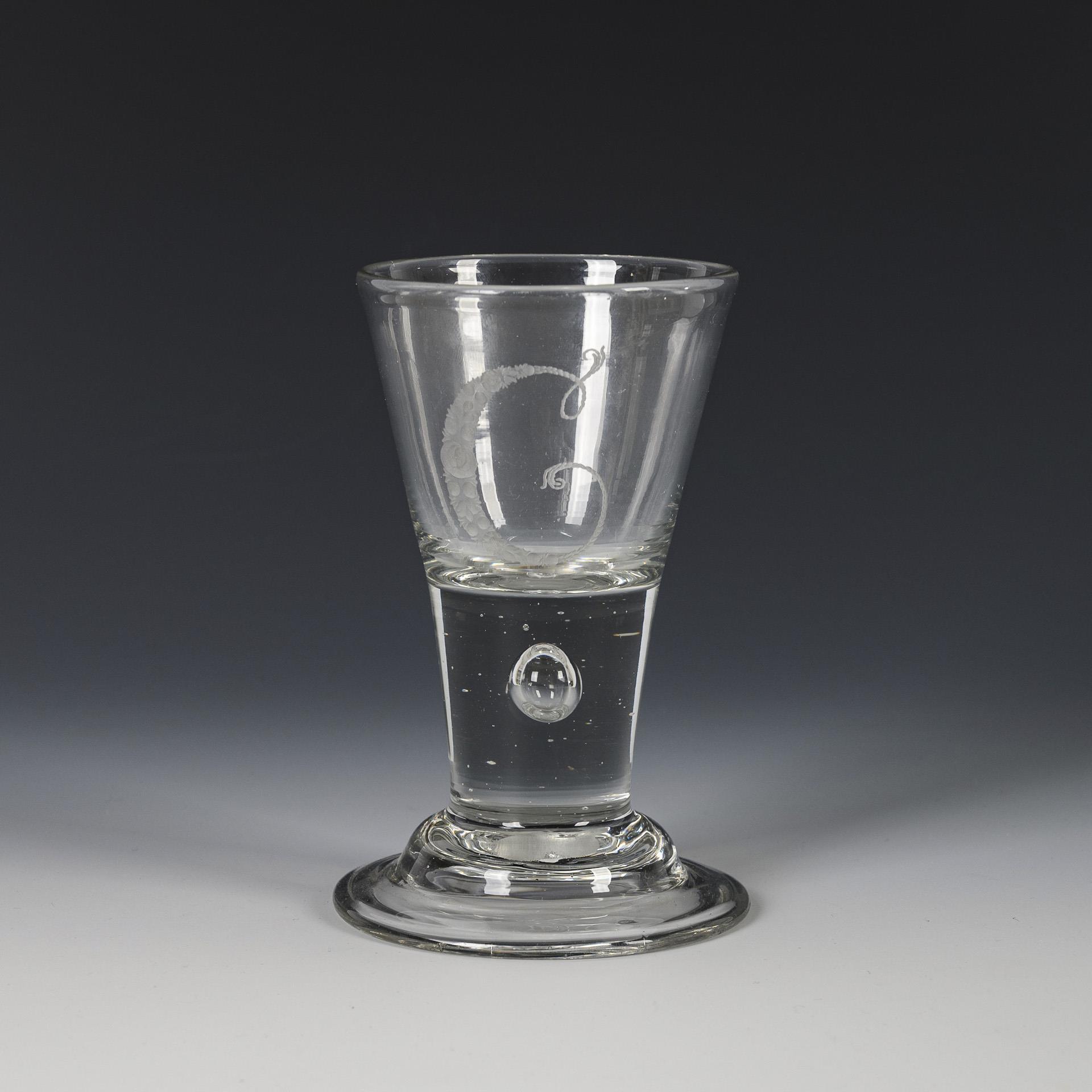 Conical bowl merging into the solid body with pierced air bubble, cap foot; cut off section. On the front the engraved letter "C".