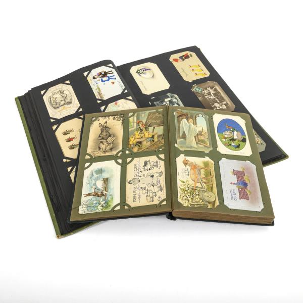 Many embossed lithographs, around 1900/10. In a very large green "Post-Cards" album and a dark "album" with lilies.