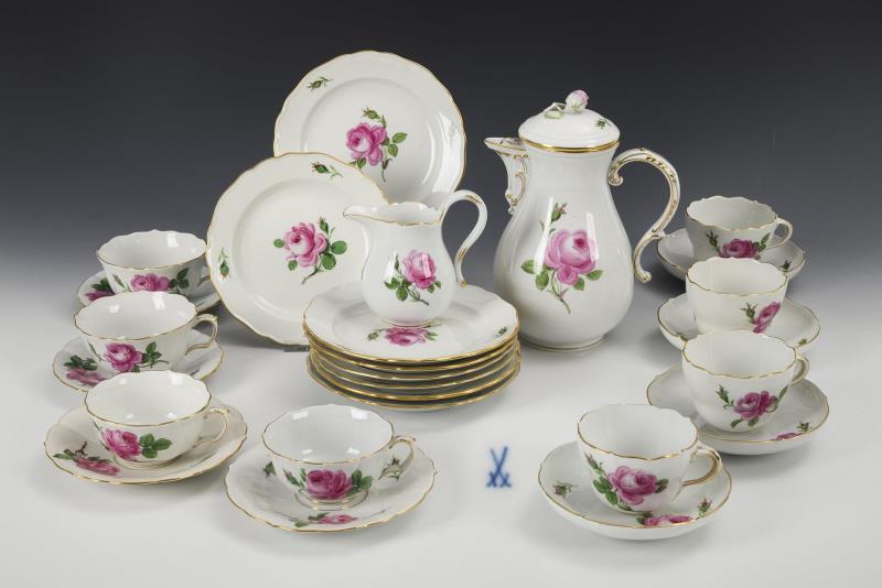 26 parts. "New cut-out" shape. Coffee pot (H 23 cm), milk jug, 4 coffee cups with 4 saucers, 2 + 2 teacups (H 2x 5 cm and 2x 5.5 cm) with 2 +2 saucers (Ø 2x 14.5 cm and 2x 15.5 cm) and 8 breakfast plates (Ø approx. 18 cm). 1 coffee cup slightly smaller and with rim chips.