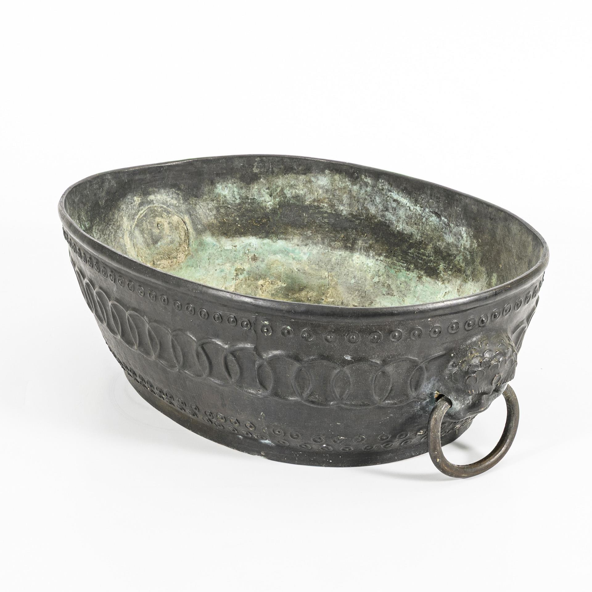 Oval shape with relief pattern and two ring-shaped handles. Inside green patina and lime deposits, underside somewhat scarred.