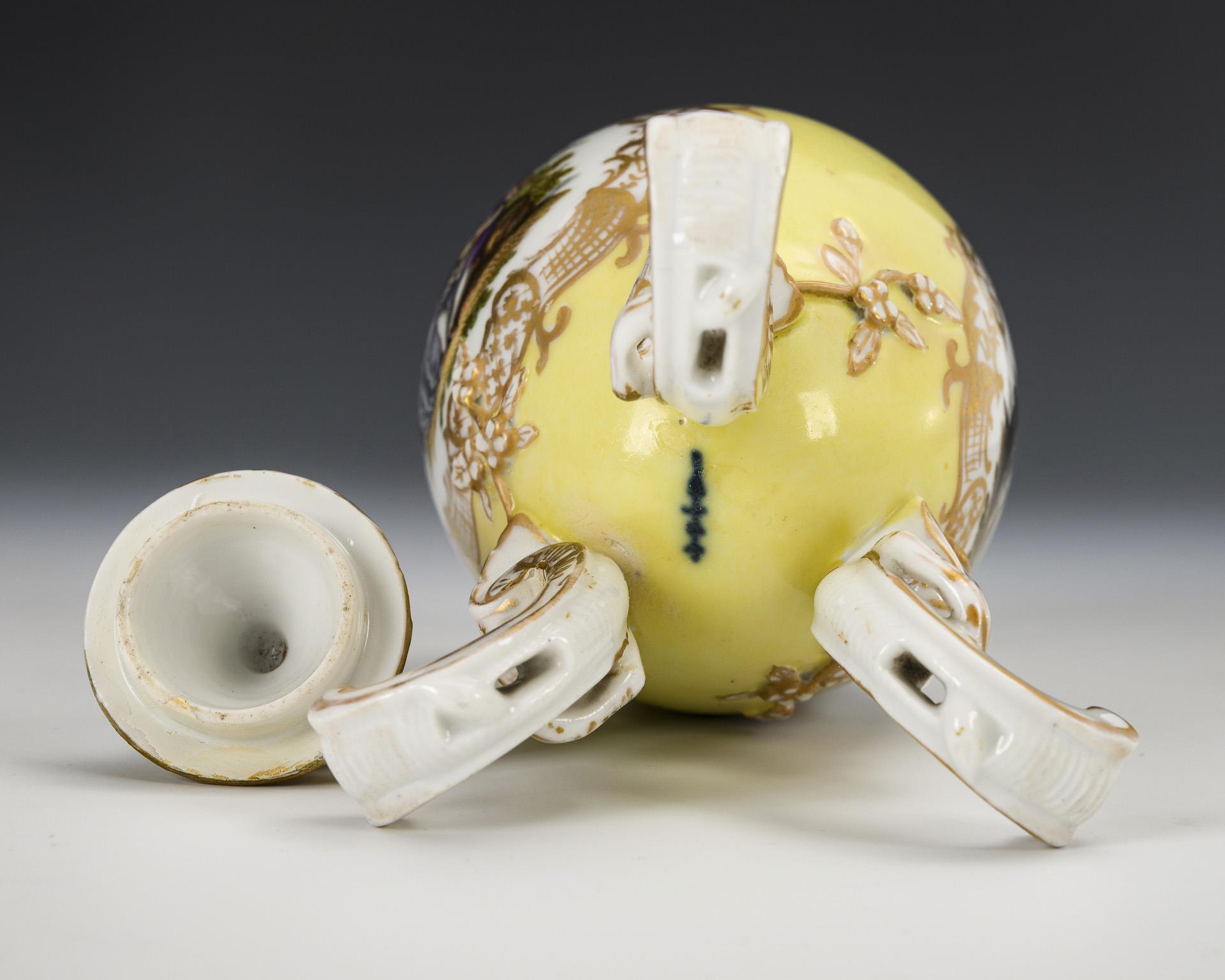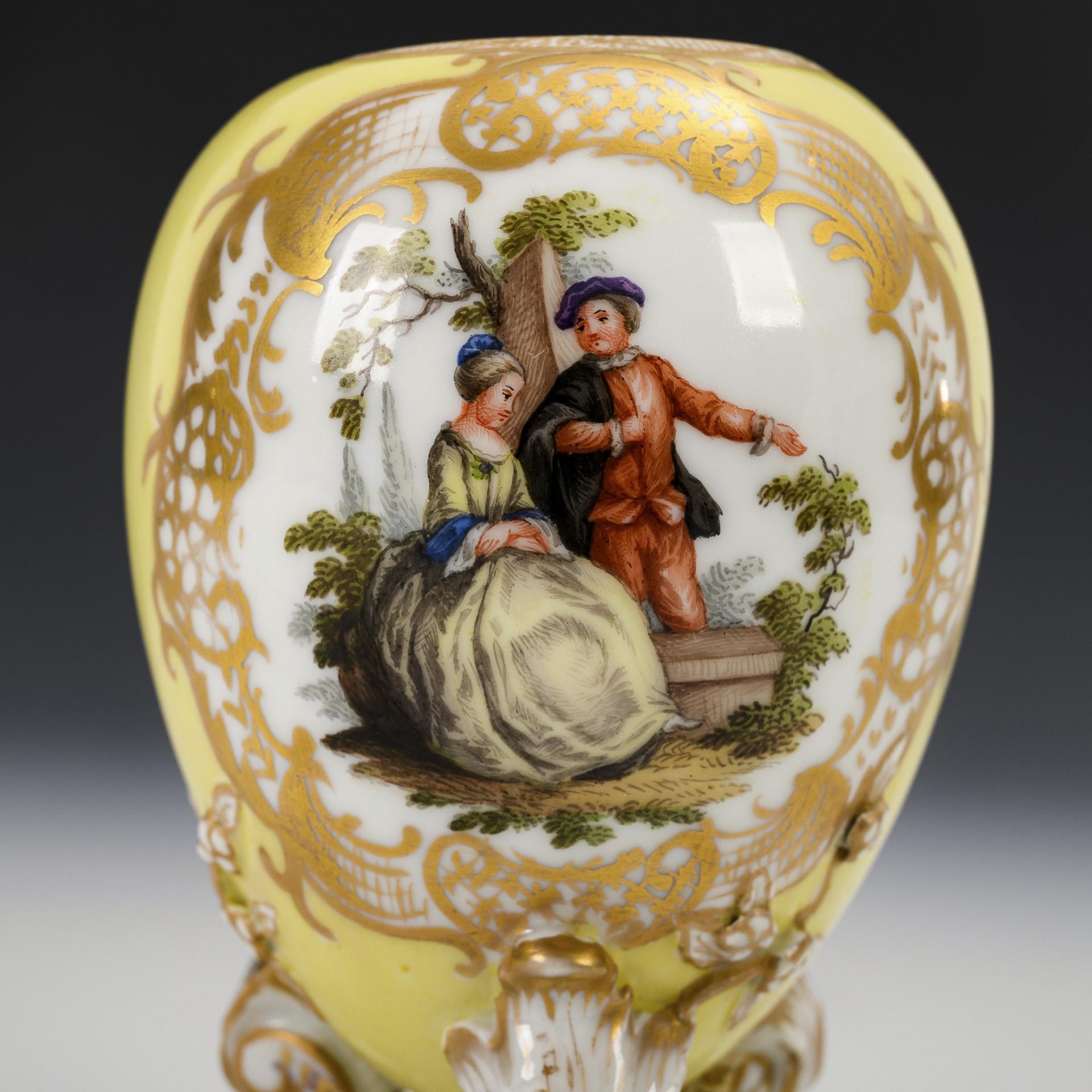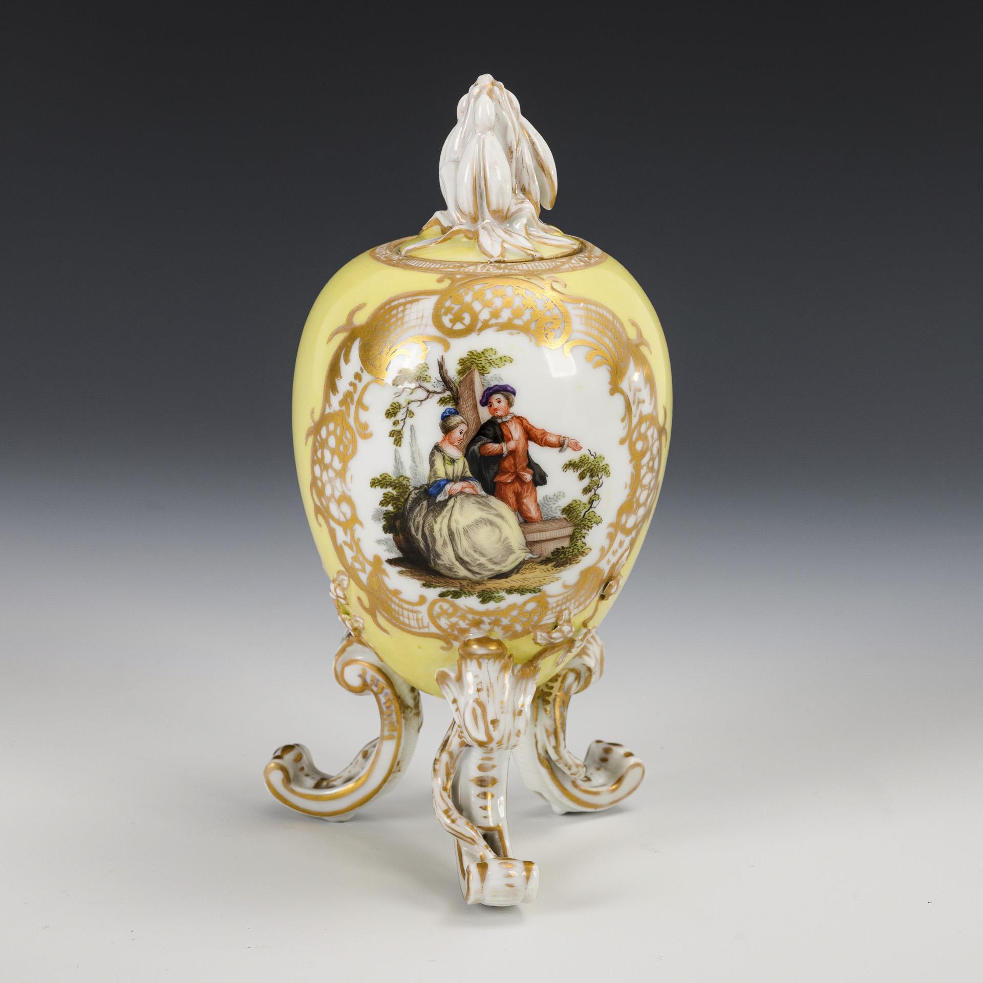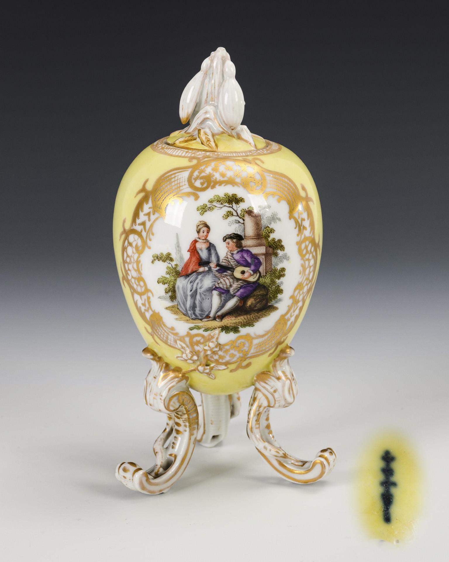 Ovoid body with snowdrop finial and three rocaille feet. Lemon yellow ground, on both sides a gold-framed oval cartouche depicting a gallant couple. 1 foot and lid rim restored, minimal gold wear.