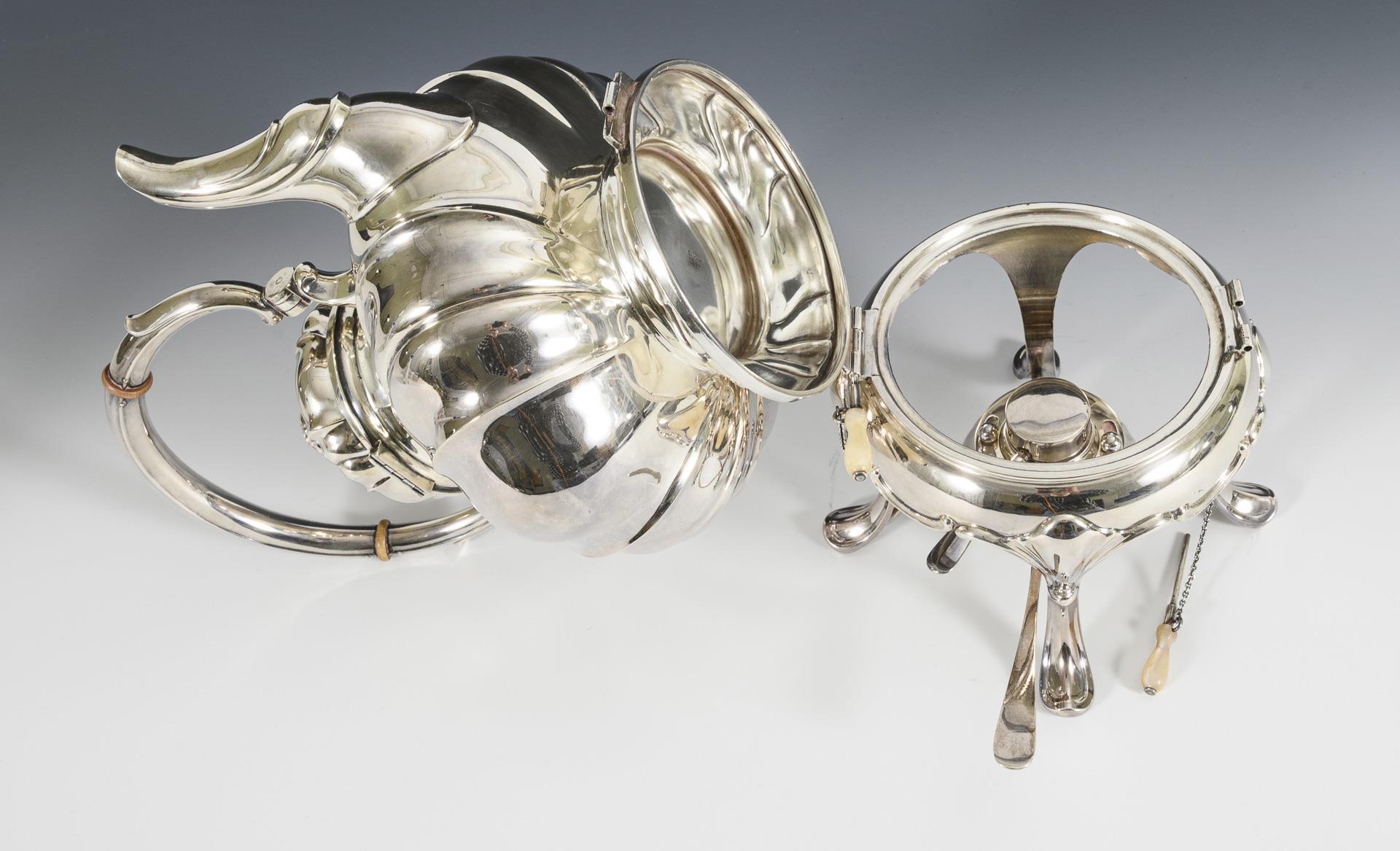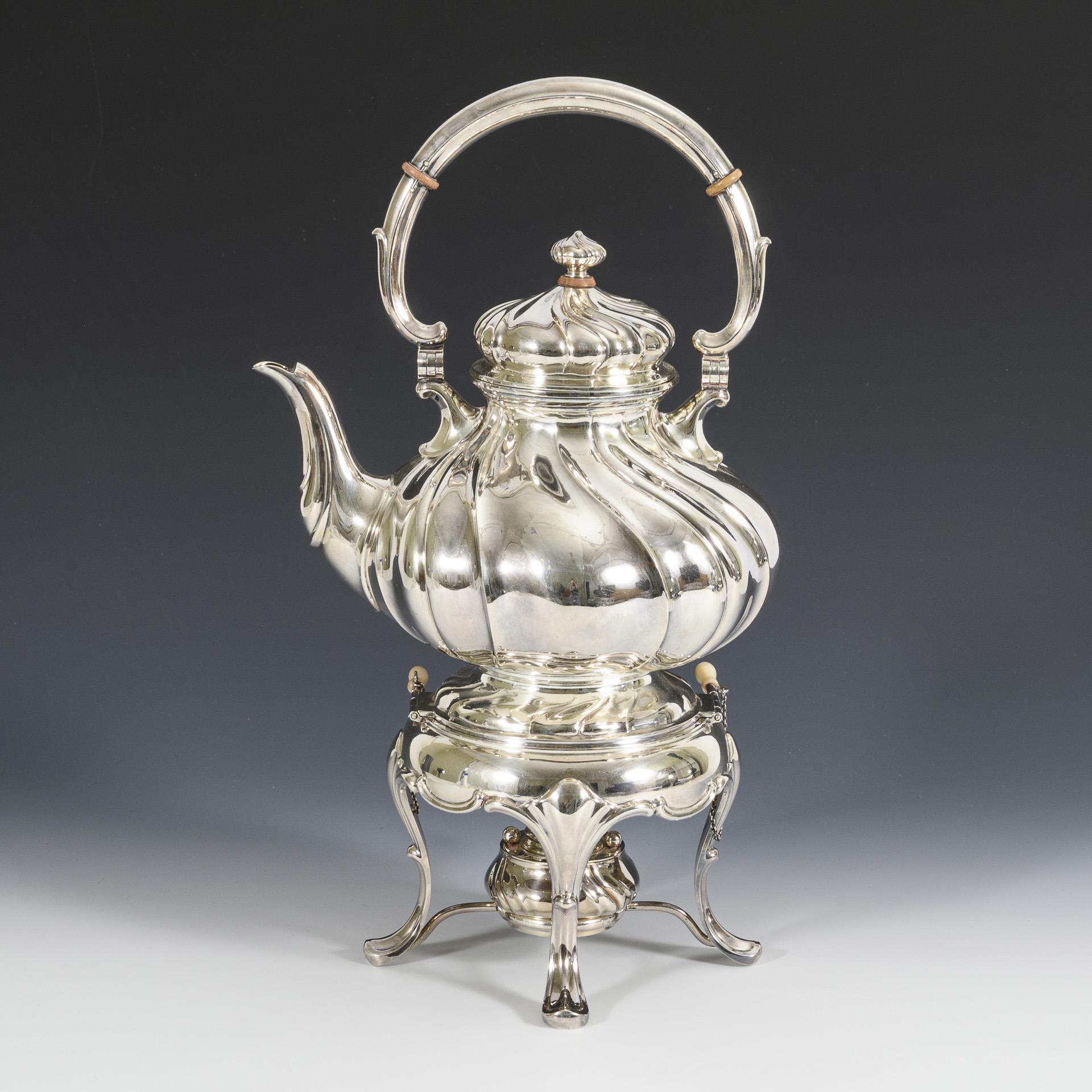 Silver teapot on rechaud. Brothers Kühn, Schwäbisch Gmünd.
