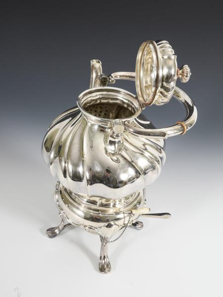 Silver teapot on rechaud. Brothers Kühn, Schwäbisch Gmünd.