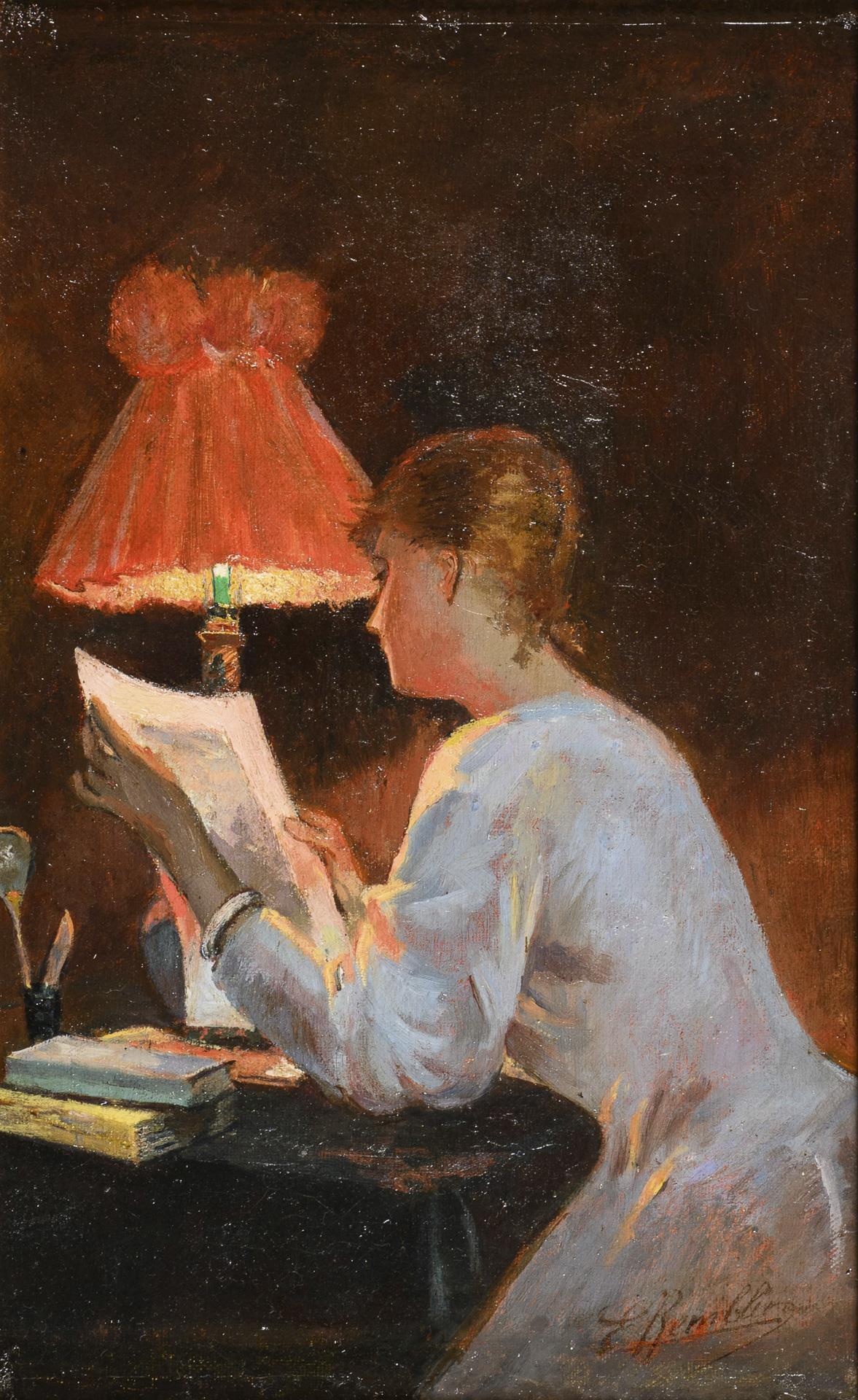 Young woman reading by the light of a lamp. Two restored areas with additional pieces of canvas.