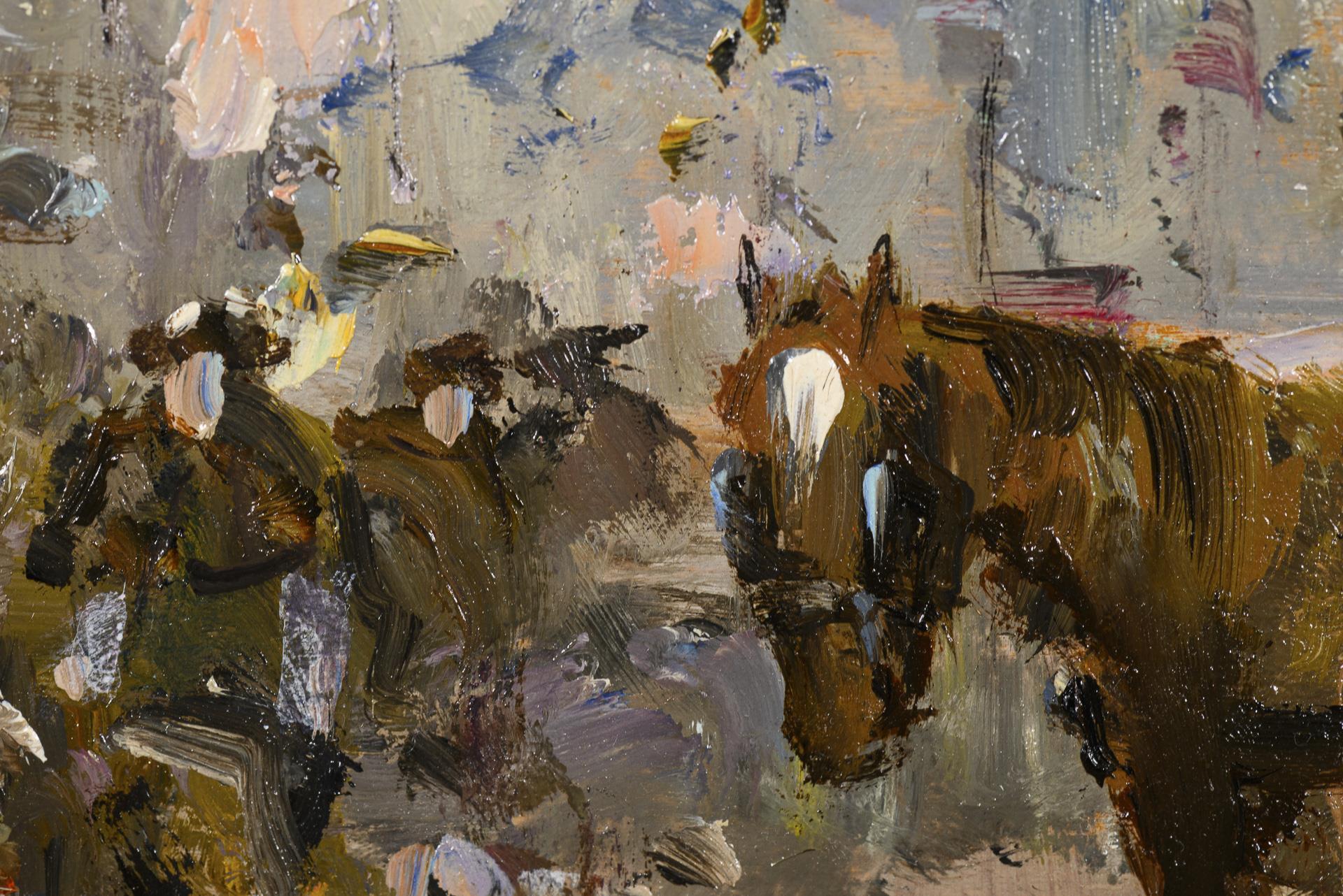 Impressionist market scene with carriage and people in the sunshine in front of a domed building.