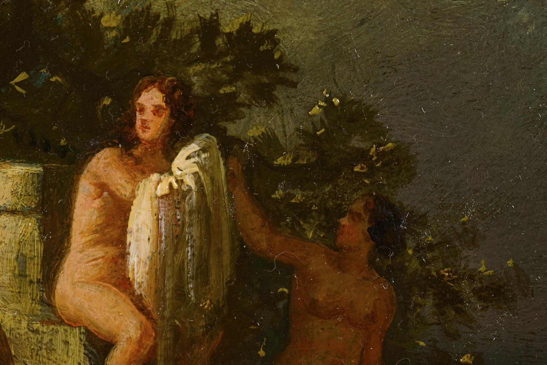 Oil/wood. Signed lower right, verso further sketch with three ladies in the forest.