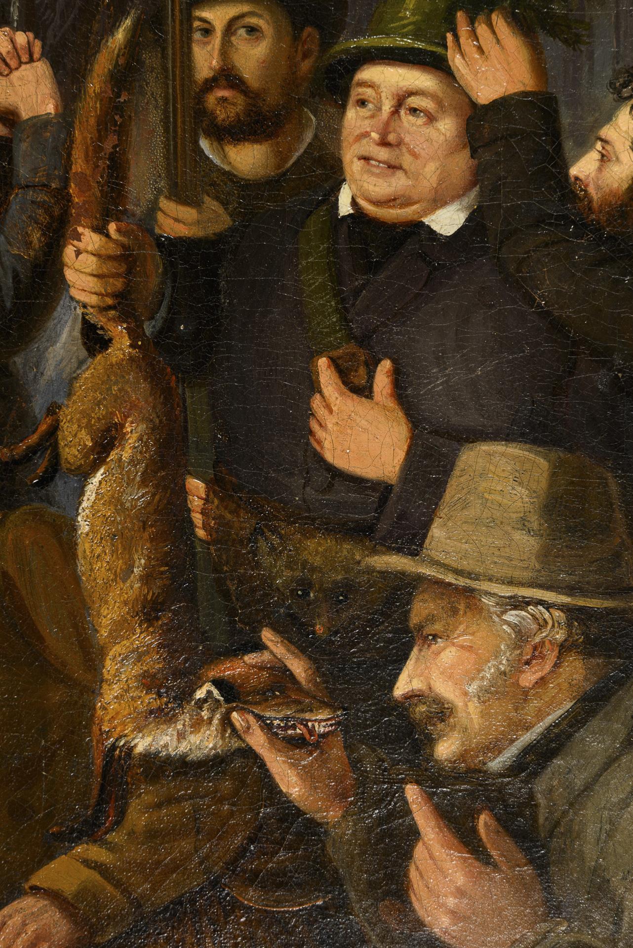 Exuberant mood after a successful hunt on a winter evening at the edge of the forest. Canvas with doubled edges, one defect.