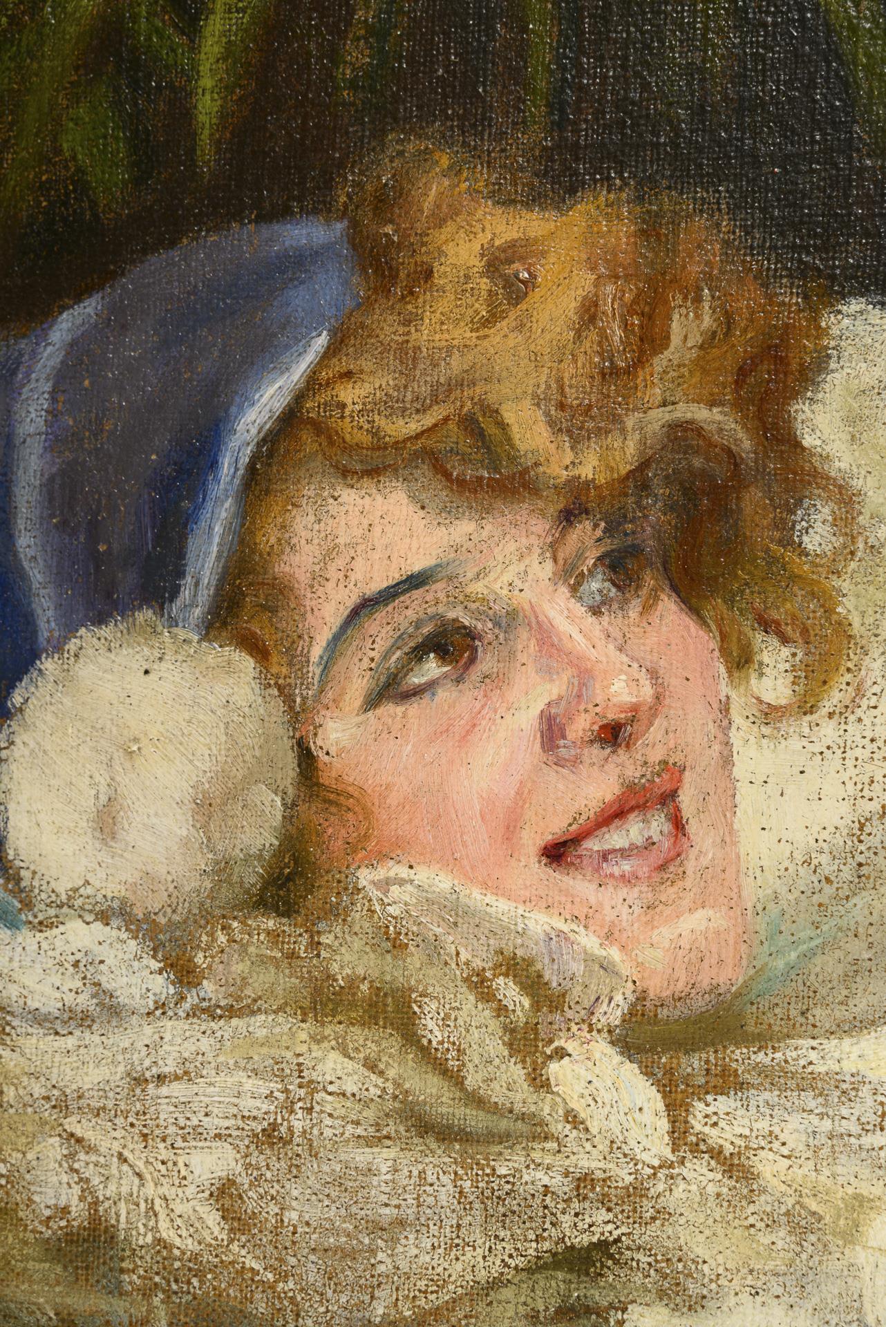 Carnival scene with a young woman in costume on a furniture and a gentleman leaning down towards her in a separee with a view of the guests in the hall. Restored with backing.