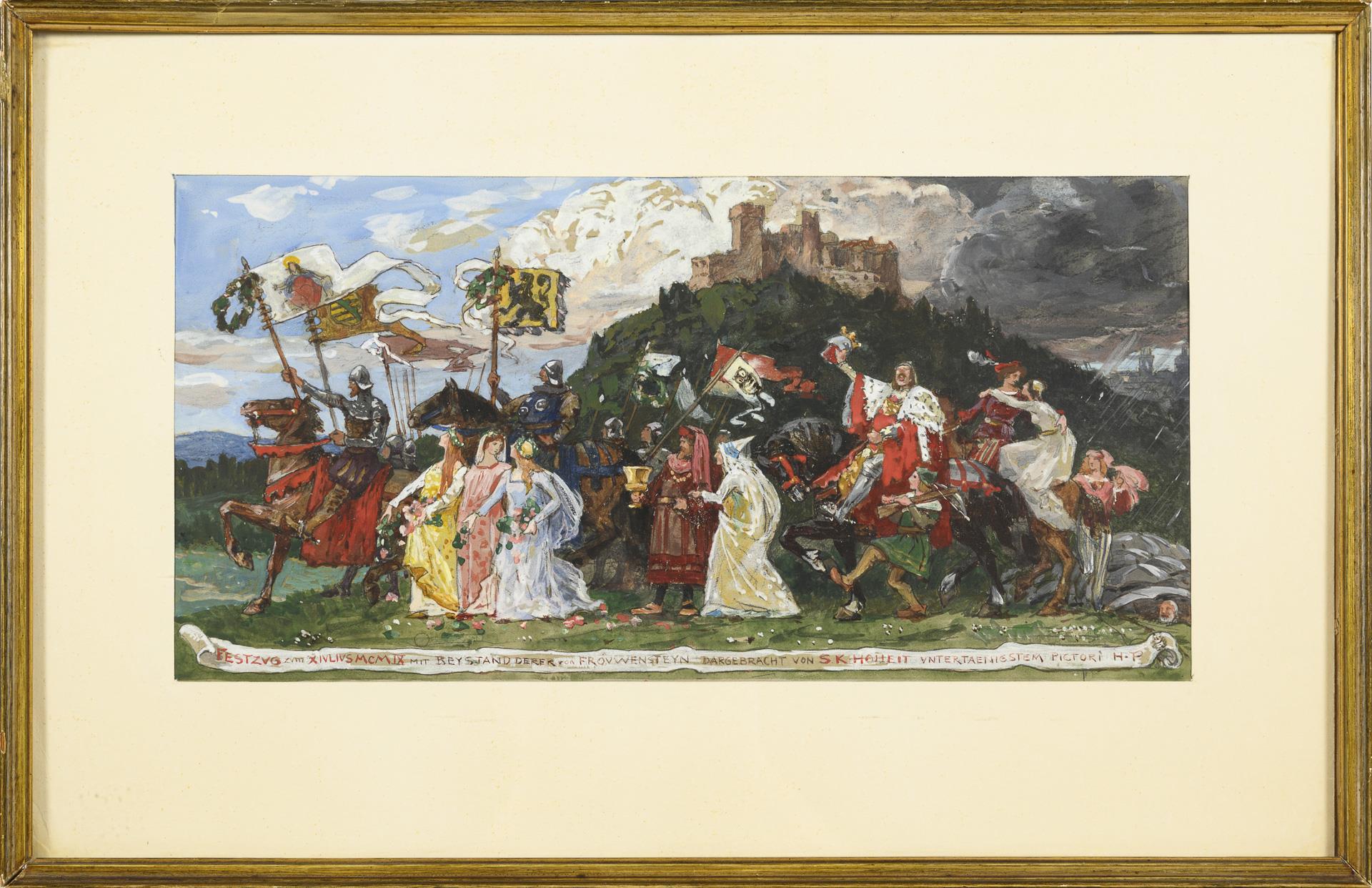 Knights and ladies of the court in front of the exuberantly gesticulating king on horseback with his retinue below the castle.