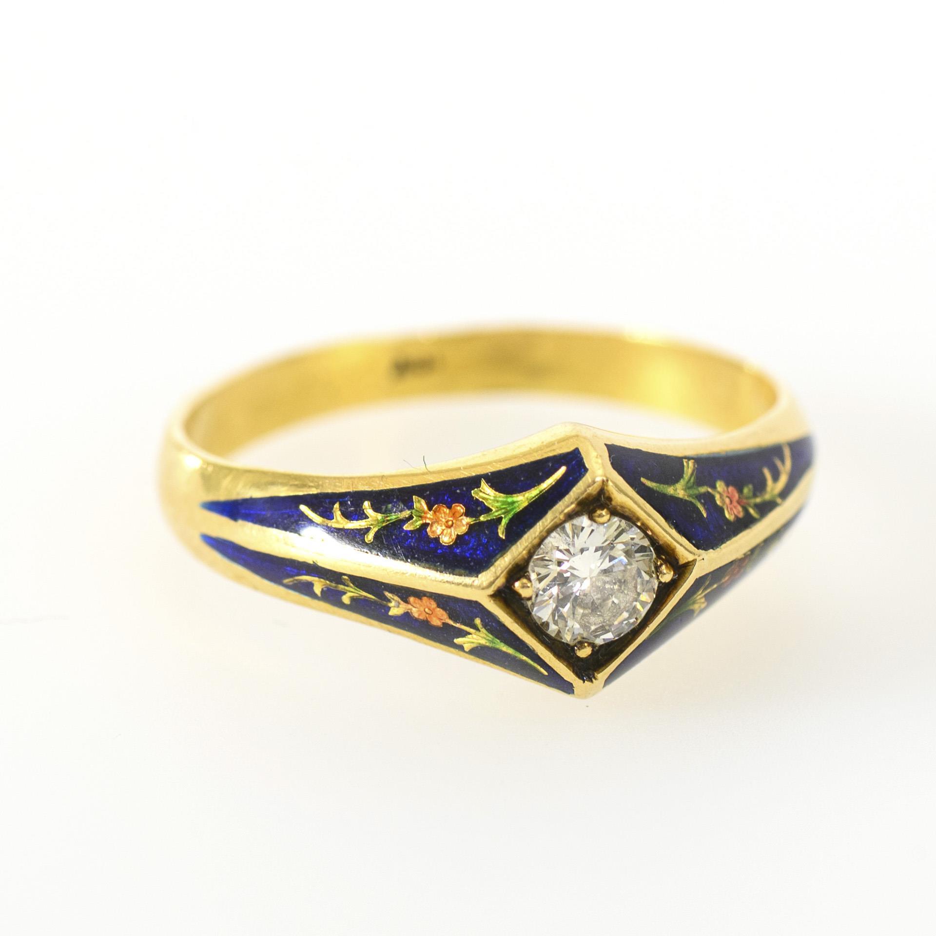Ring in a historical design with brilliant-cut diamond, the ring shoulders in blue and with floral details in green and red with cold enamel. Slight signs of wear to the ring band.