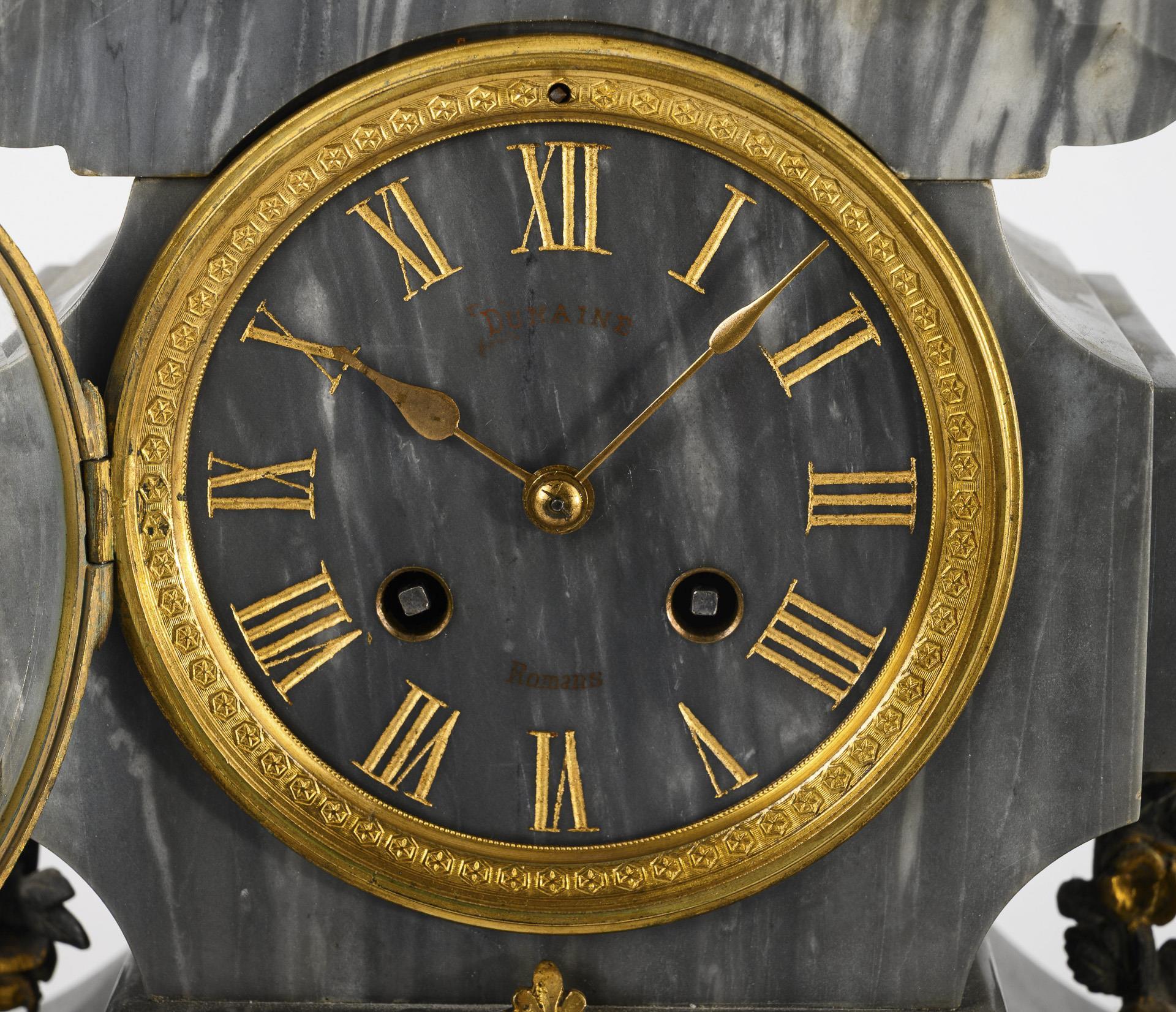 Unmarked movement with half-hour strike on bell. Functional in short time test, overhaul recommended. Dial with Roman numerals and hour markers, marked "Dumaine Romans".