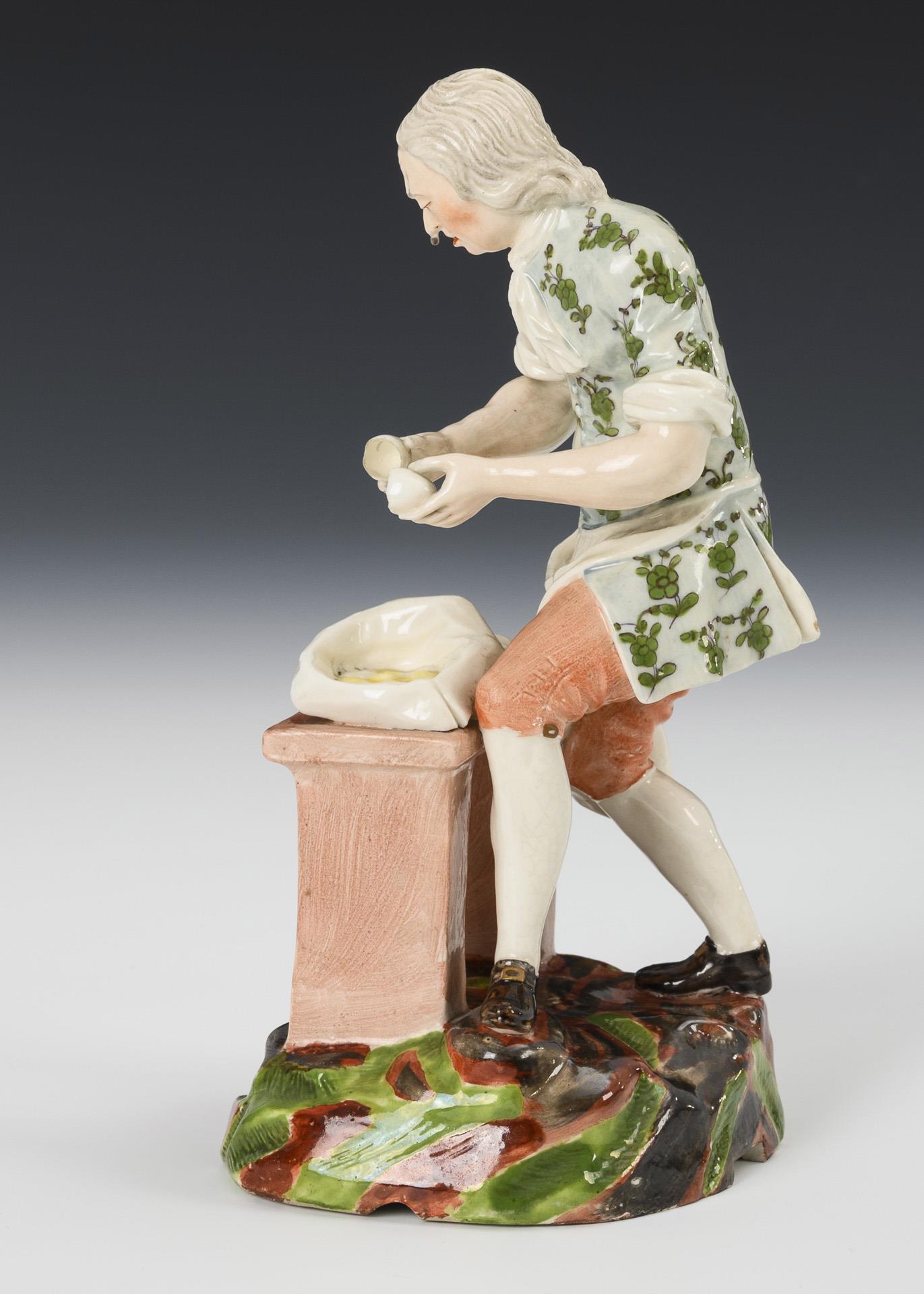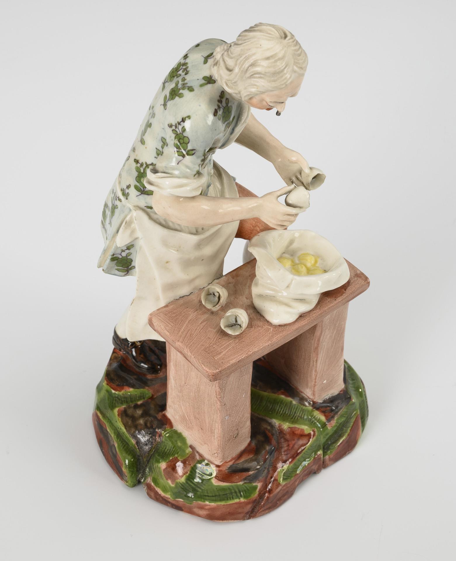 Cook standing at a stone bench, cracking eggs into a cap.