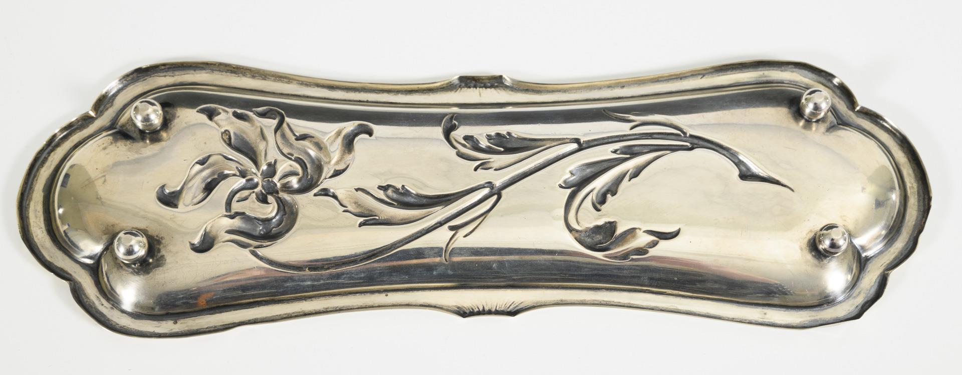 Elegant pen tray with iris in relief. 2 ball feet minimally compressed.