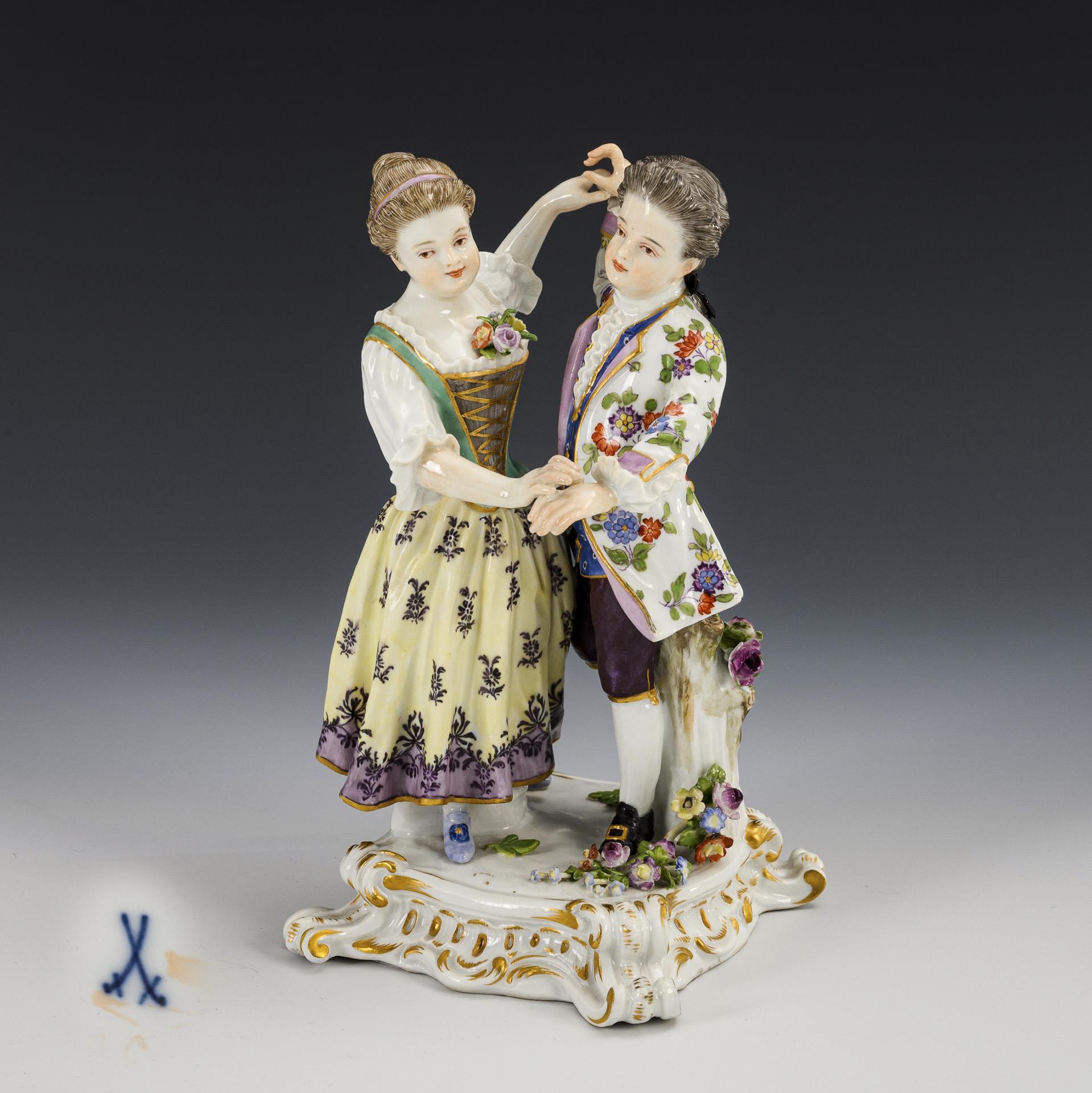 A pair of dancing children standing on a rocaille base with flowers. The girl's right hand and some of the flowers and leaves restored.