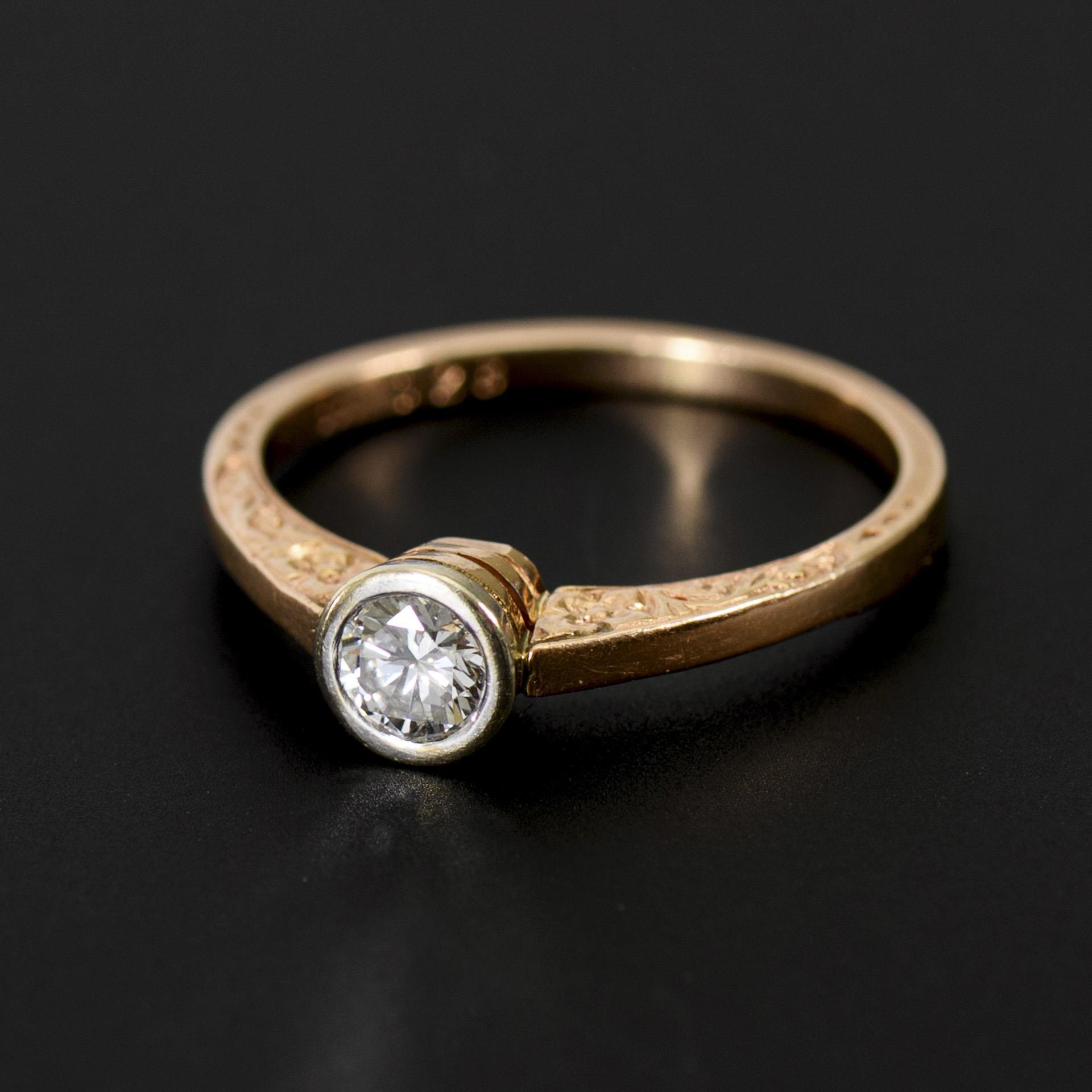 Marked yellow and white gold 585, brilliant-cut diamond additionally stamped with 028 [0.28 ct]. Ring size 52. 2.3 g.