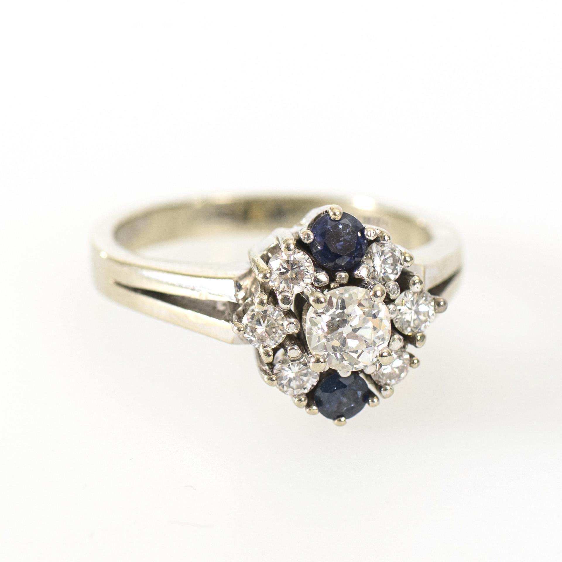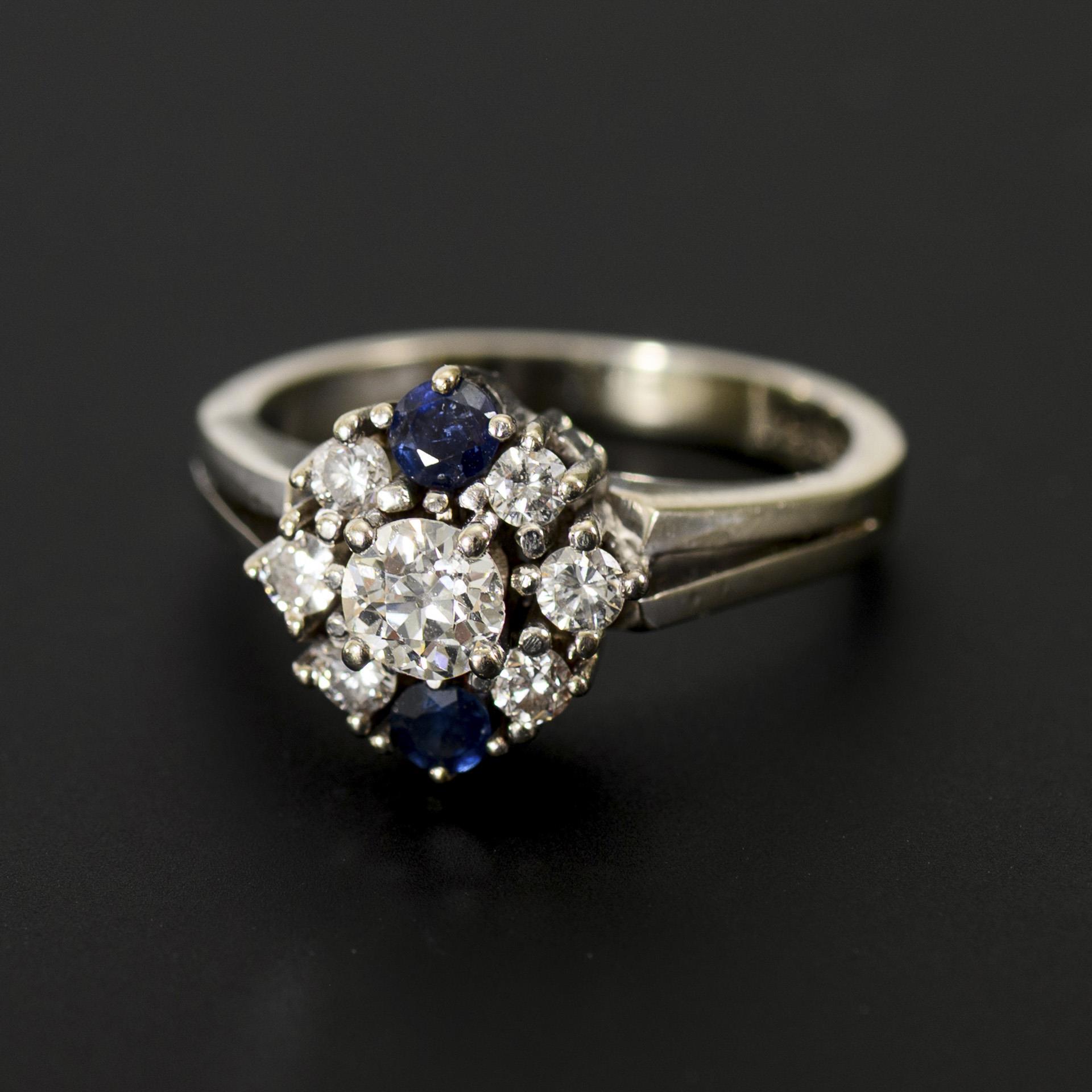 Ring head flower-shaped, set with 7 brilliant-cut diamonds and 2 blue colored stones, probably sapphires, in chaton setting.
