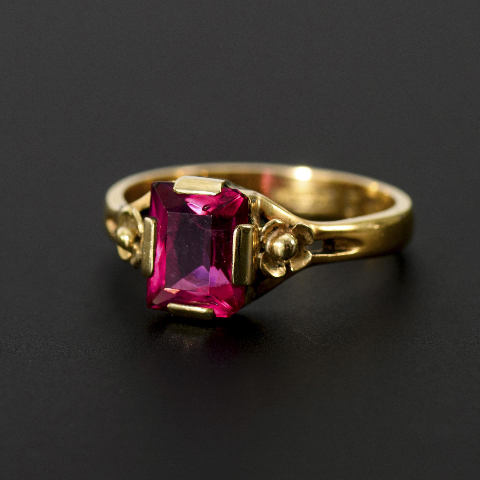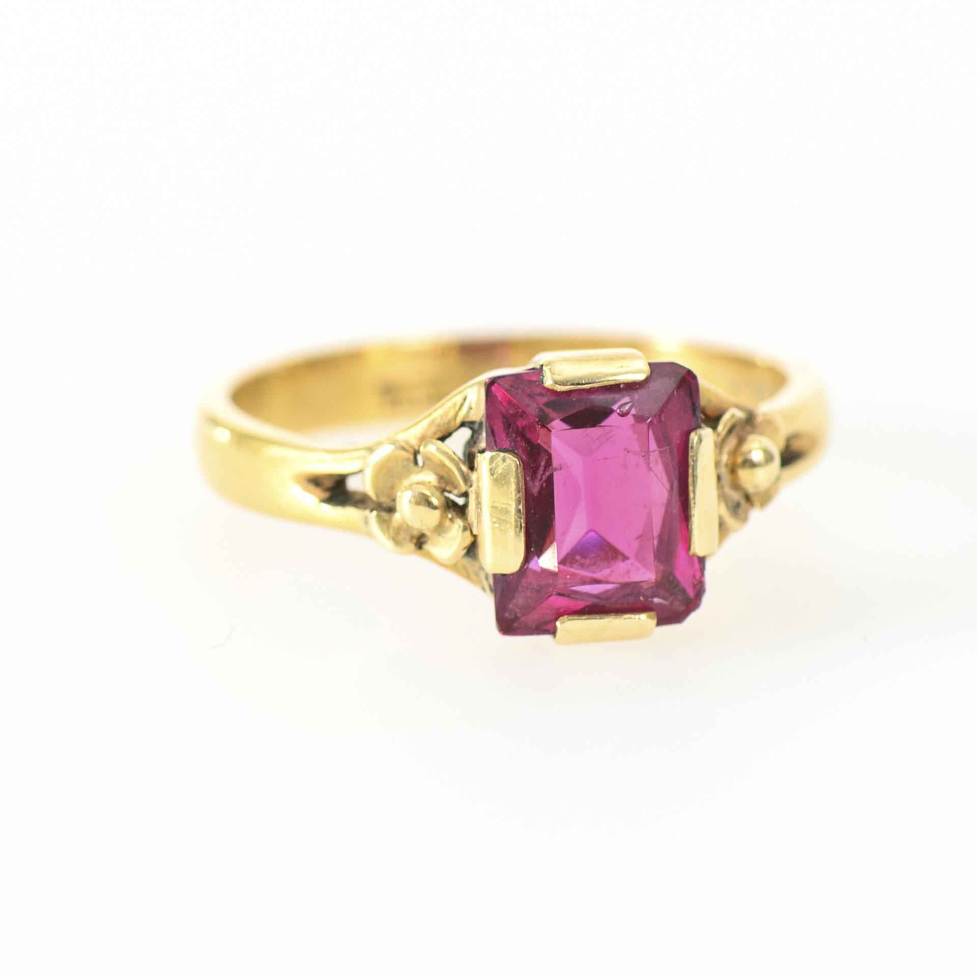 Ring with claw-set red colored stone, each side decorated with a delicate yellow gold blossom. 2 corners of the stone chipped.