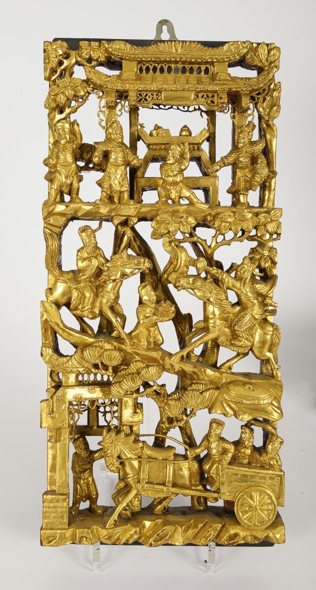 One frame and four panels with openwork carvings. One panel in a deeply staggered design, one panel carved on both sides. Painted in gold and red or blue.